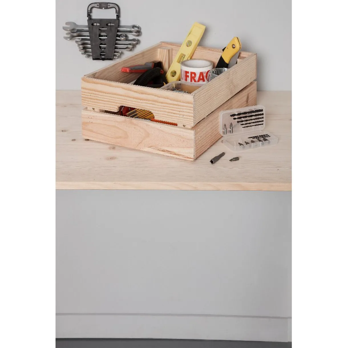 Caisse rectangulaire en pin massif avec emplacement poignée sur deux côtés, à monter soi-même.