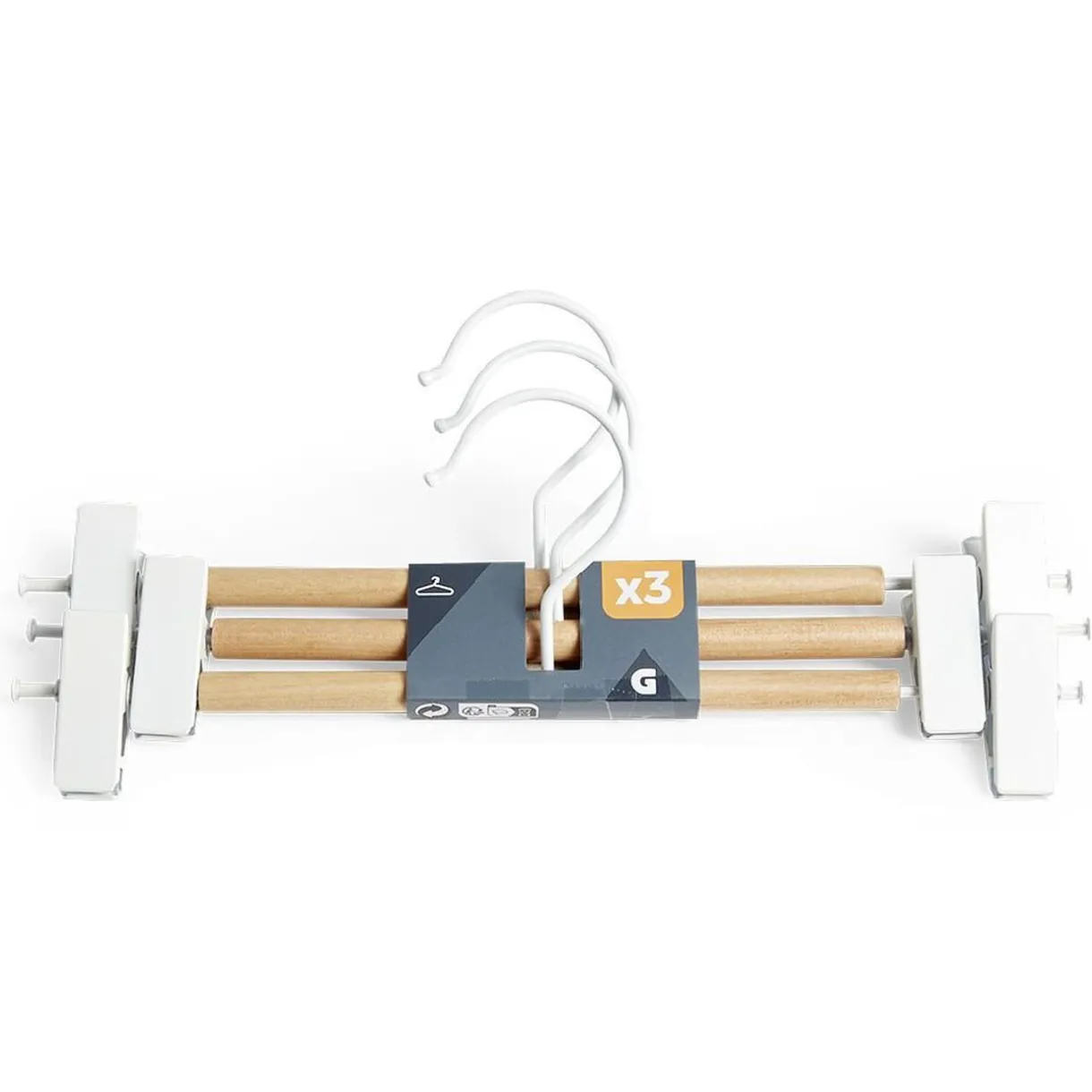 Accrochez vos vêtements avec élégance avec ce lot de 3 cintres à pinces en métal blanc et en bois naturel.