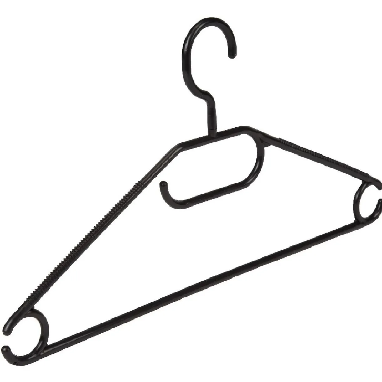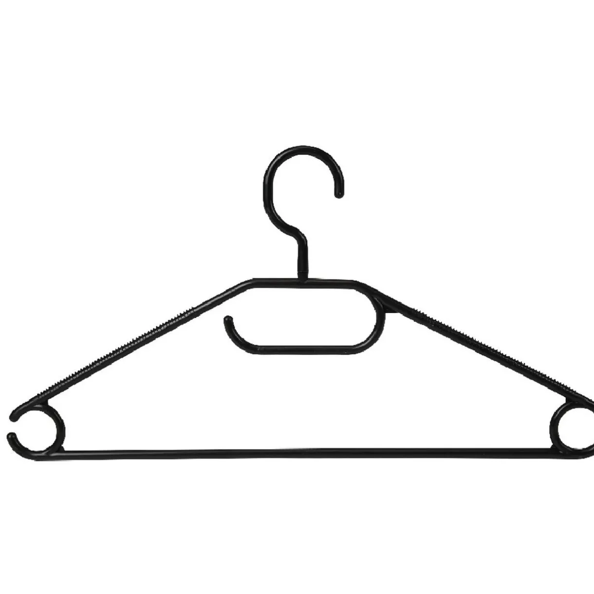 Lot de 10 cintres en plastique noir à crochet rotatif, dessus antidérapant et encoche pour bretelles.