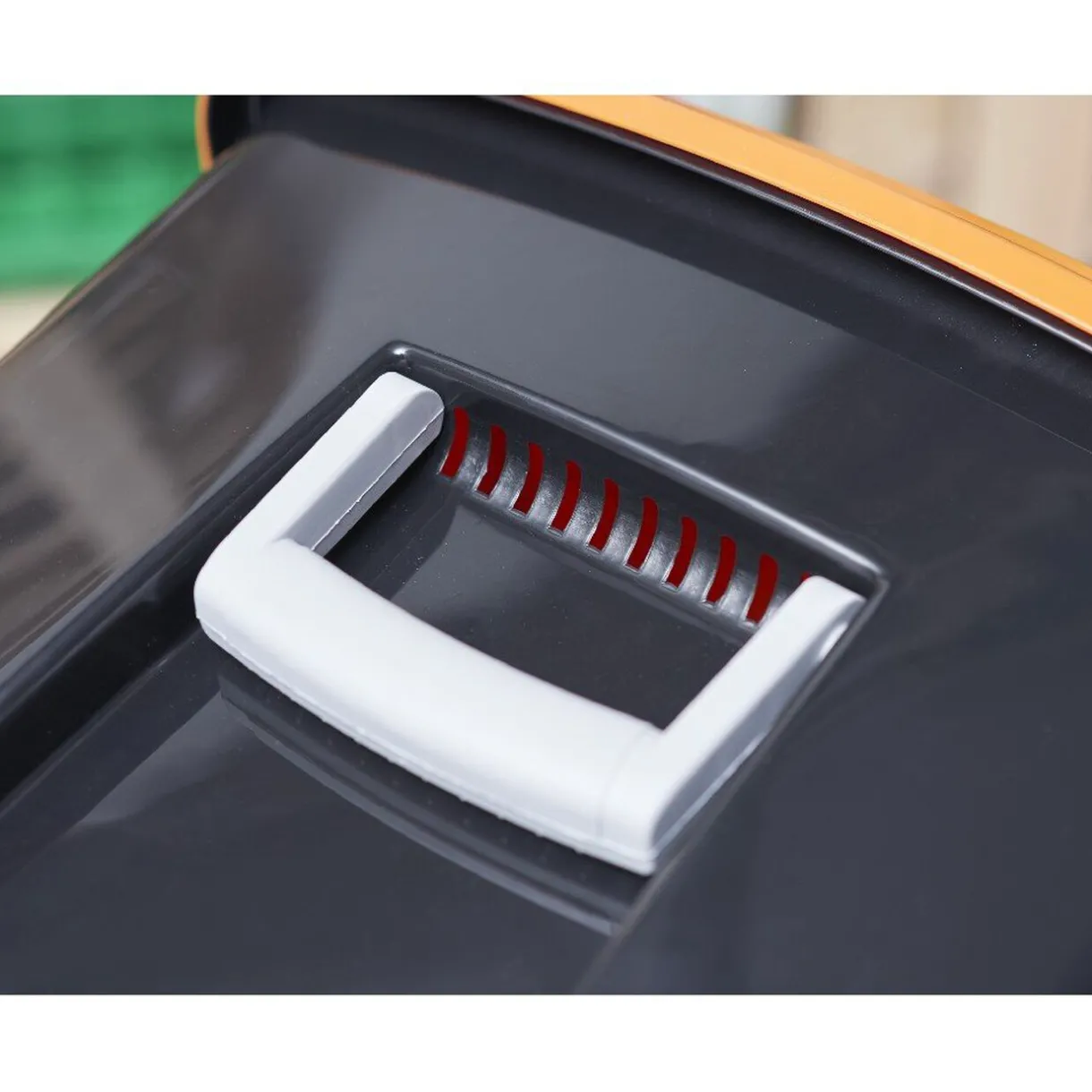 Coffre de rangement noir d’une contenance de 70 L avec couvercle clipsable orange.