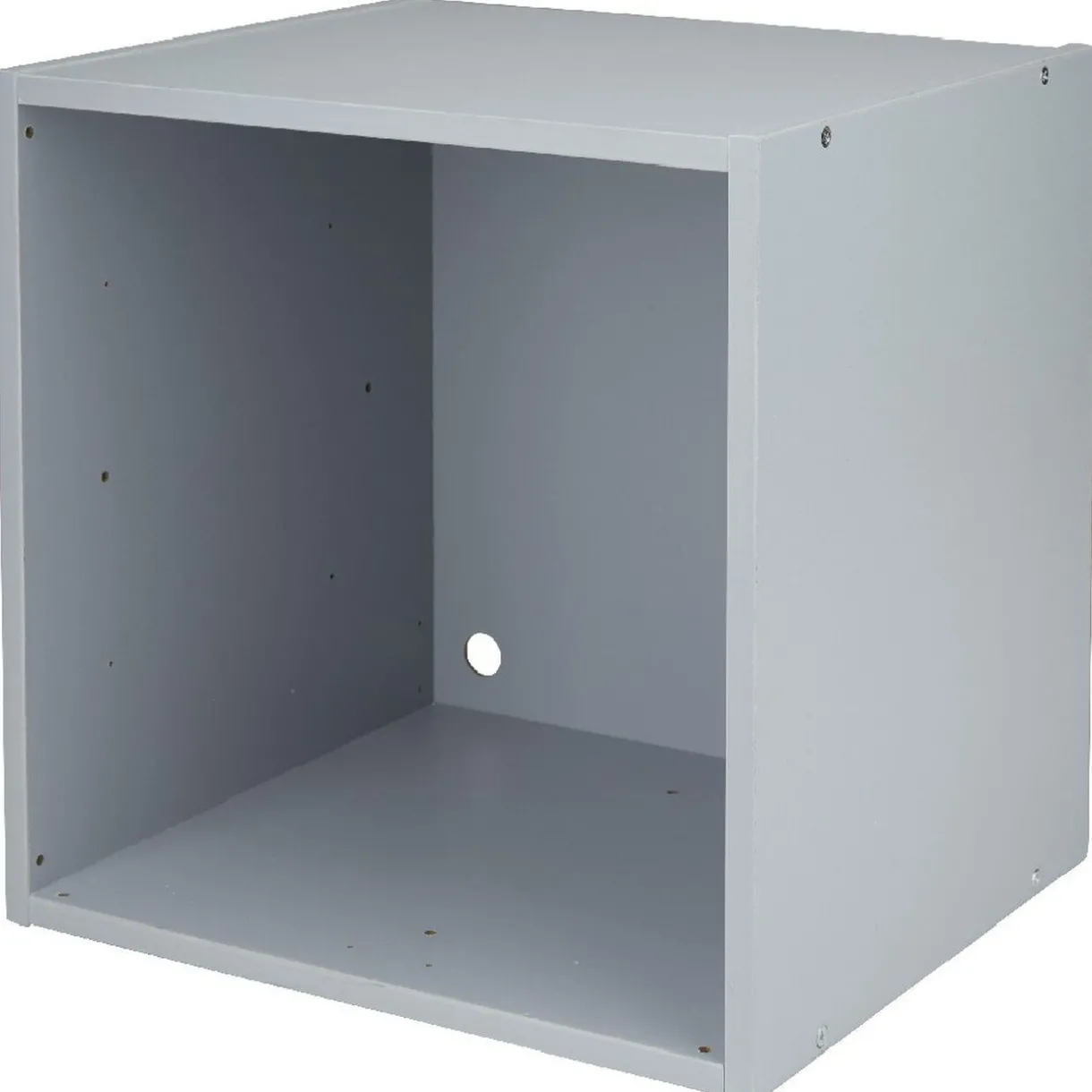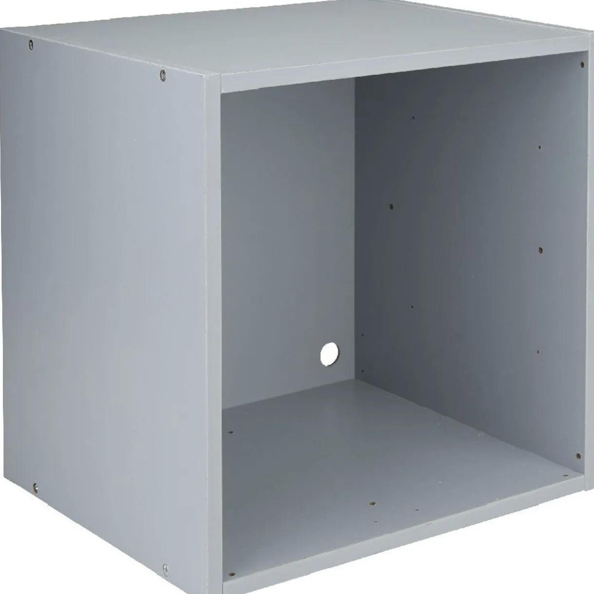 Cube étagère de rangement en panneaux de particules de bois gris.
