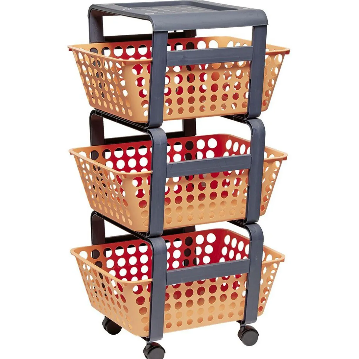 Desserte de rangement sur 3 niveaux avec panières oranges amovibles.