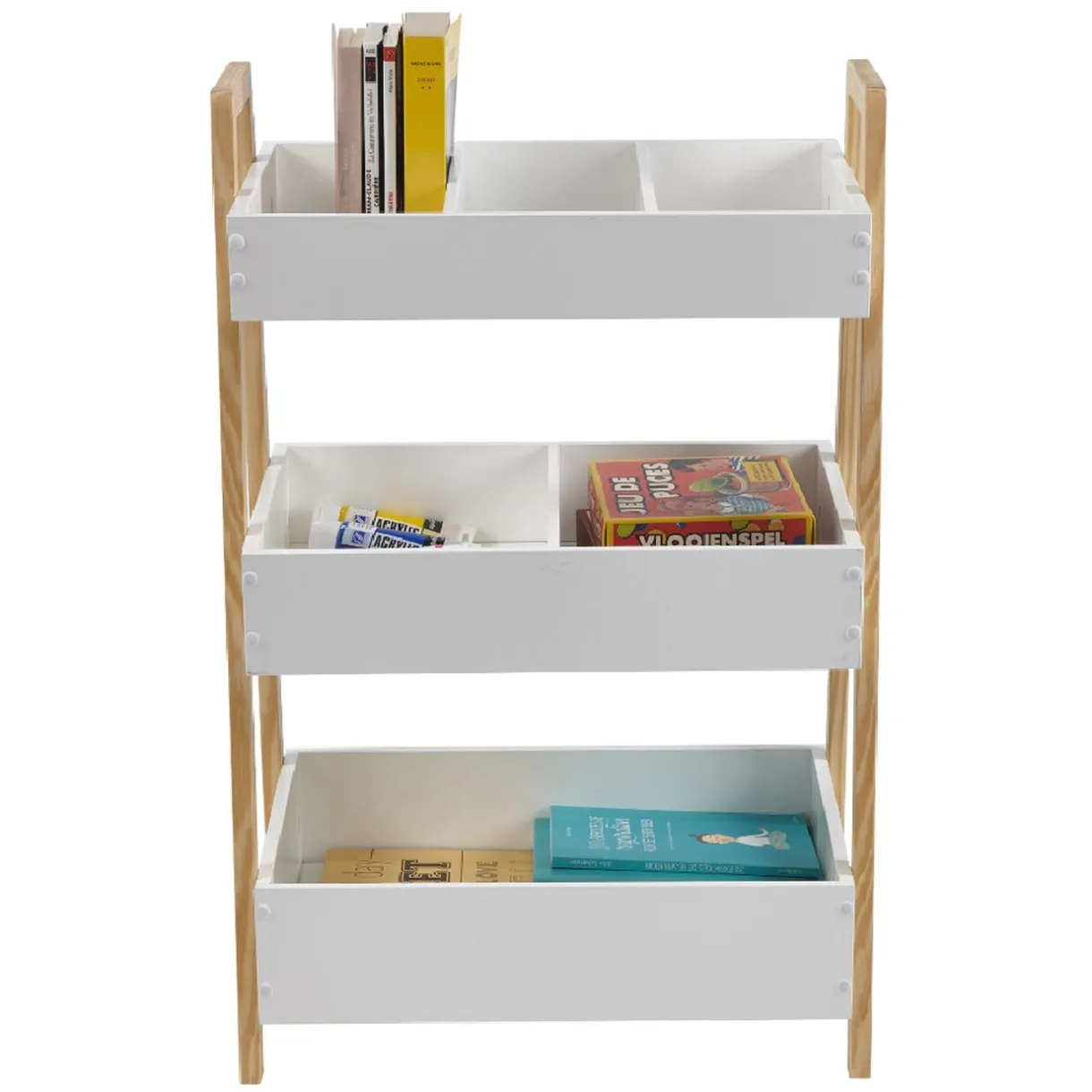 Design et pratique pour organiser votre espace, cette desserte à 3 niveaux en mdf et pin bicolore blanc naturel saura trouver sa place dans tous les espaces. Équipée d’un grand bac et deux autres compartimentés, elle vous servira de bibliothèque, étagère à jouets dans une chambre, de rangement supplémentaire dans le séjour ou encore pour organiser vos produits de beauté dans la salle de bain… A vous de choisir l’emplacement idéal de cette desserte au charme naturel et cosy pour votre intérieur!