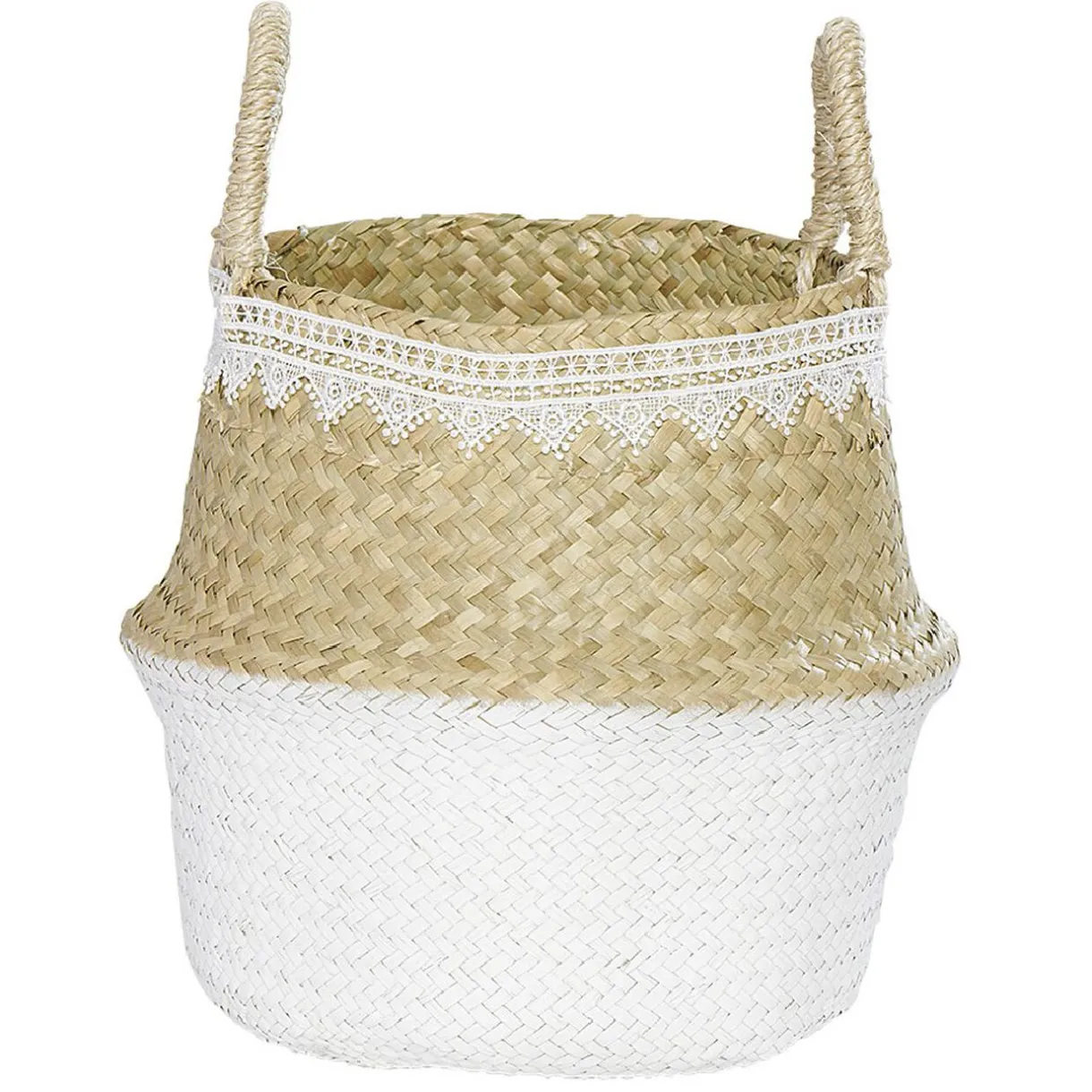 Lot de 2 panières en jute et dentelle de couleur naturelle et blanche.