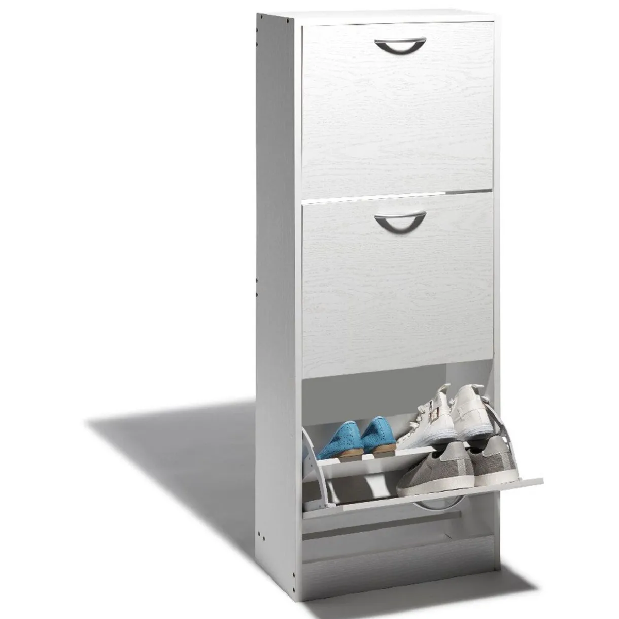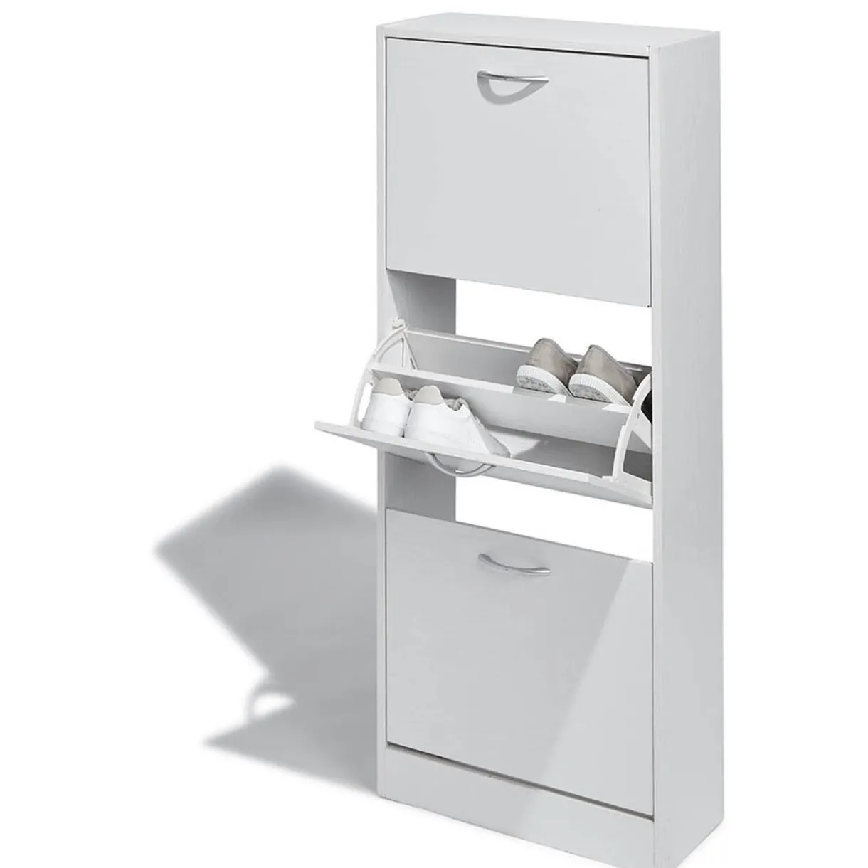 Vos souliers ne traîneront plus au sol grâce au meuble à chaussures Utah ! Dans votre couloir près de votre porte d’entrée, installez-le puis profitez d’un grand espace de rangement grâce à ses 3 tiroirs battants. D’une faible largeur, il ne prendra que peu de place dans votre intérieur, tout en donnant la possibilité de placer jusqu’à 12 paires de chaussures. Vous pouvez également utiliser sa surface afin d’ajouter un peu de décoration dans votre pièce. N’hésitez pas à y placer vos photos, vos plantes, ou encore vos statuettes. D’un design contemporain, il dispose d’une structure en panneaux de particules revêtue de papier décor. De couleur blanche, n’hésitez pas à installer ce meuble afin de rajouter une note esthétique au design de votre pièce. Installez également les autres meubles de la gamme Utah pour un mobilier complet. Étagère, chiffonnier ou encore buffet, vous avez à votre disposition toutes sortes de meubles afin d’harmoniser votre intérieur.