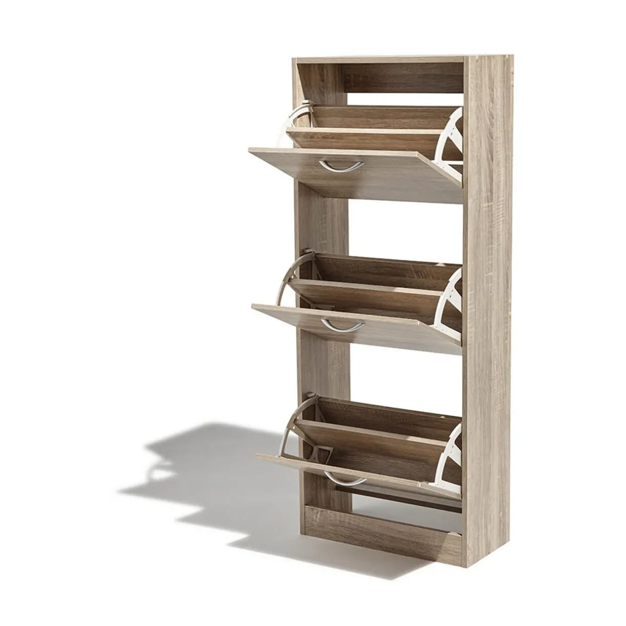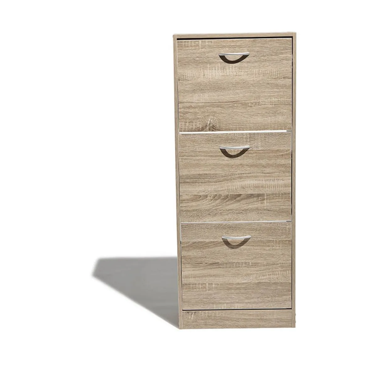 Grâce au meuble à chaussures Utah, rangez tous vos souliers ! Utilisez le design moderne de ce meuble afin de disposer tous vos baskets, vos ballerines ou encore vos sandales. Dans votre couloir ou votre chambre à coucher, il trouvera aisément sa place tout en embellissant votre pièce. Les 3 tiroirs répartis sur une colonne vous proposent de grands espaces de rangement que vous pouvez utiliser selon vos besoins et selon votre organisation. Peu encombrant, ce meuble vous permettra de glisser jusqu’à 12 paires de chaussures. En panneaux de particules, sa structure est revêtue de papier décor afin de lui apporter une protection supplémentaire. Sa couleur naturelle le rend idéal pour toutes sortes de décoration. Selon votre ameublement, vous pouvez utiliser ce meuble afin d’obtenir un design de pièce haut en couleur ou rustique. Si vous souhaitez harmoniser votre pièce, découvrez les autres meubles de la gamme Utah que vous pouvez associer avec celui-ci, tels que la table basse, l’étagère ou encore la commode.