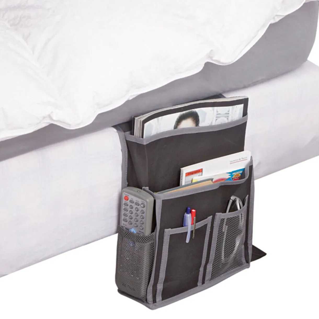 Glissez l’organisateur entre le sommier et le matelas et rangez facilement tout type d’objets. 100 % polyester.