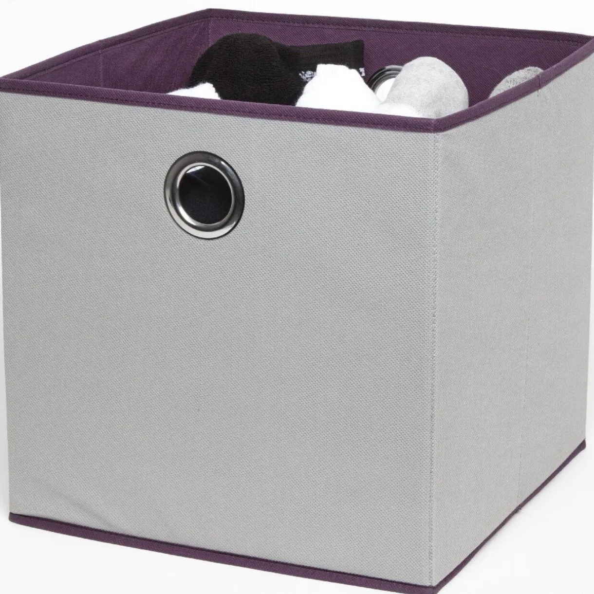 Panier de rangement gris et violet, taille M, dim. 33x33x33 cm, carton et polypropylène.