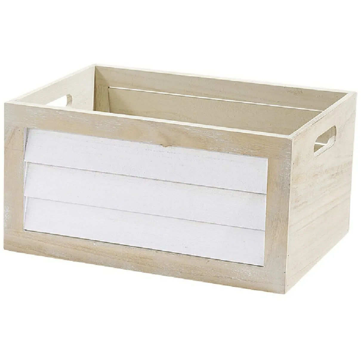 Panier déco pour salle de bain en forme de caisse de couleur naturel et blanc.