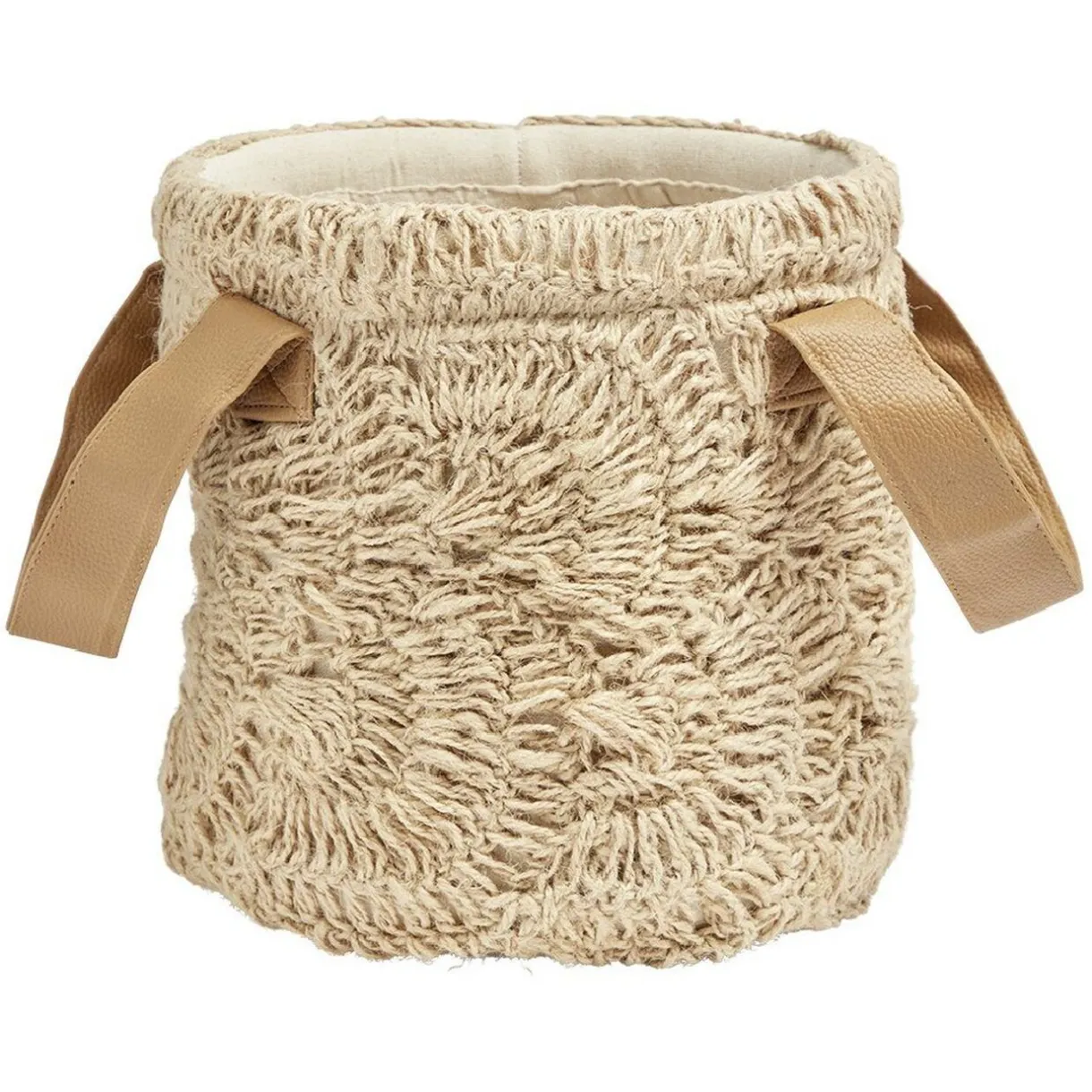 Panier de rangement style bohème, en jute et dentelle avec poignée effet cuir, trouvera sa place n’importe où dans votre intérieur avec sa teinte naturelle.
