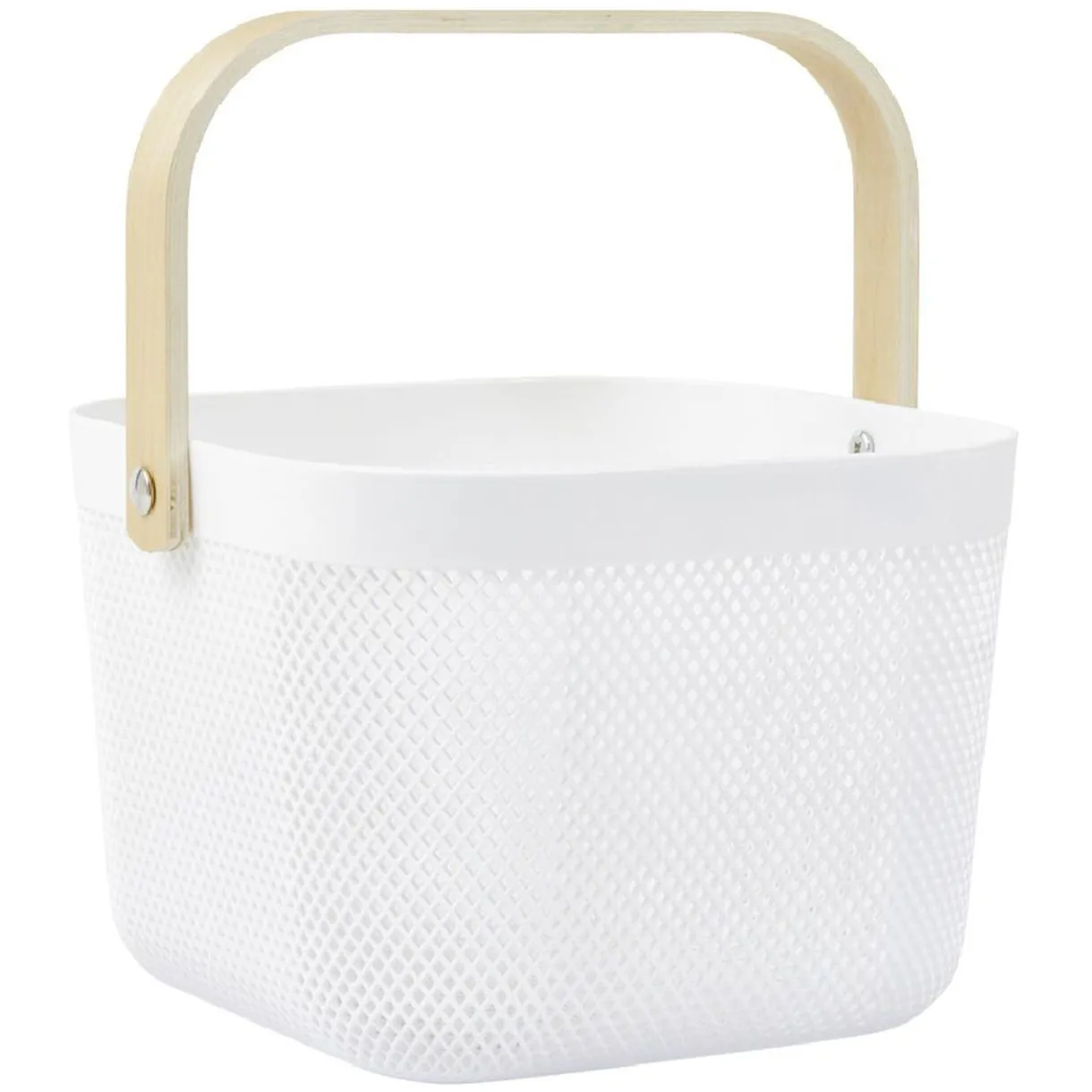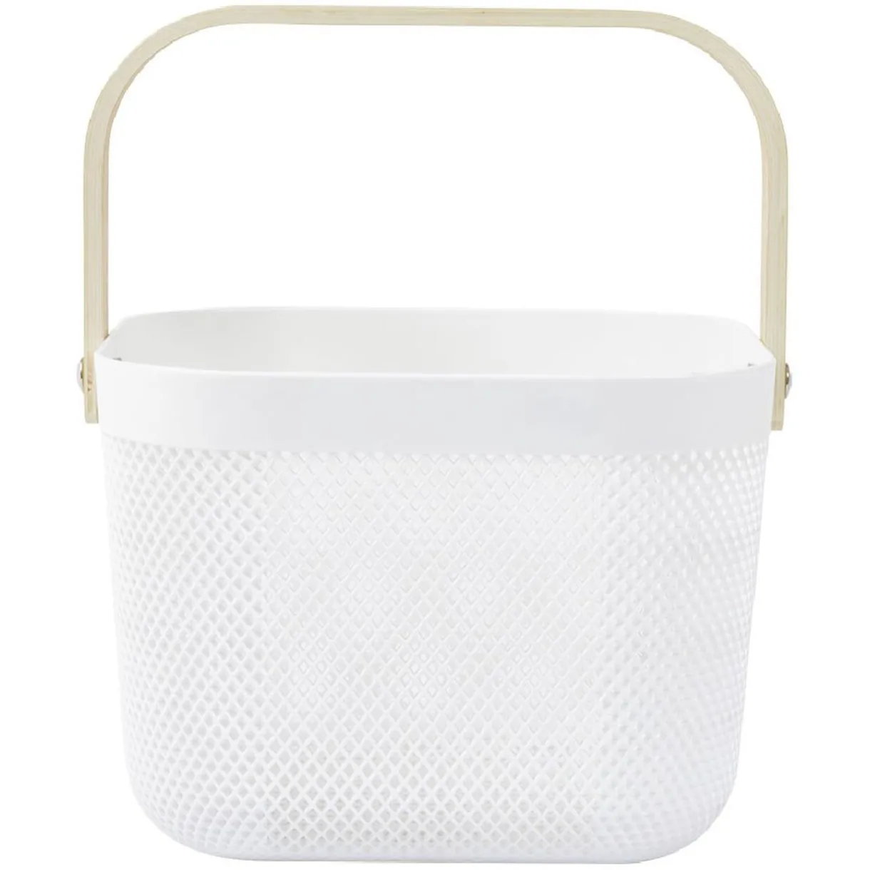 Panier de rangement en plastique blanc avec anse effet bois, décoratif et pratique pour organiser votre intérieur.