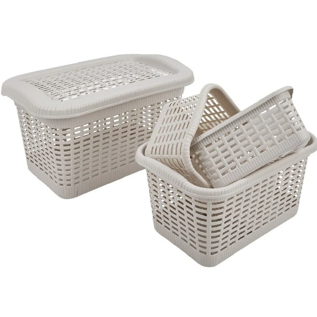 Lot de 4 panières en plastique avec couvercle taupe, différentes tailles pour tout ranger!