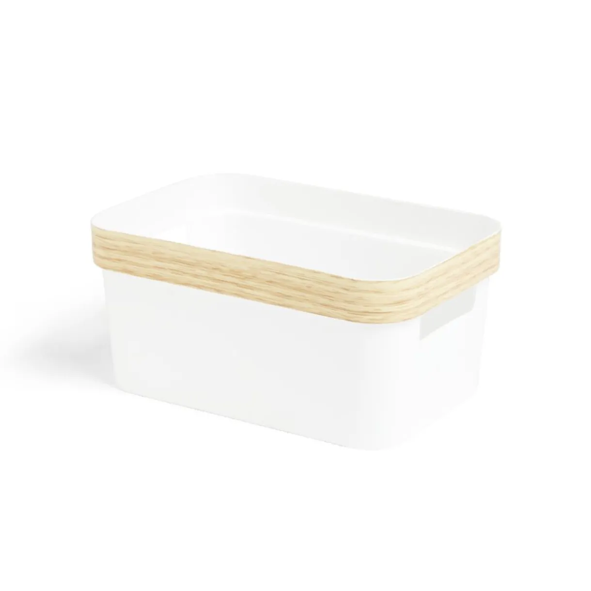 Optez pour cette panière blanche avec rebord imitation bois pour un rangement élégant et pratique.