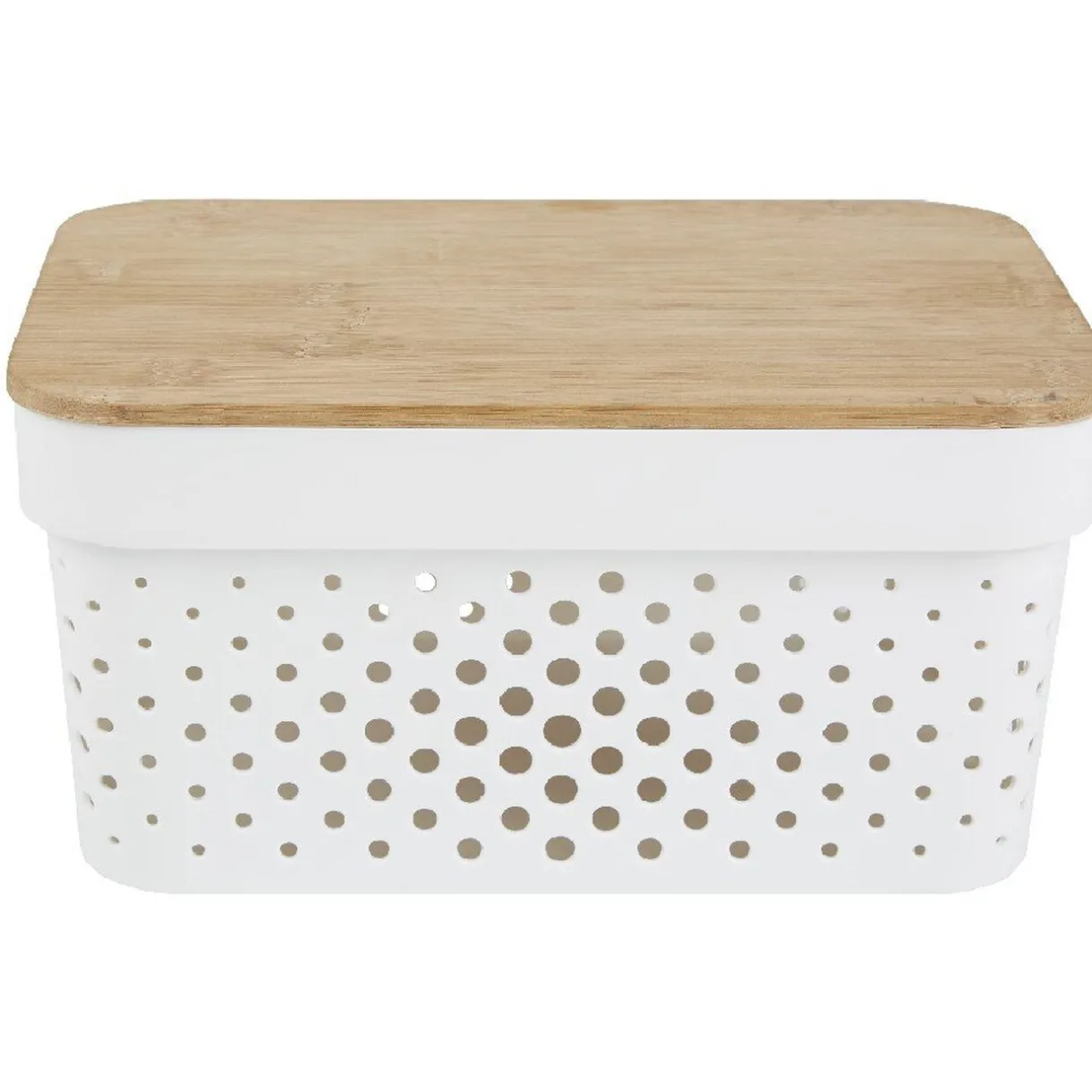 Jolie panière de rangement en plastique blanc ajouré avec couvercle en bambou. Superposable et ultra déco, cette jolie boîte de rangement trouvera sa place dans toutes les pièces de votre intérieur que ce soit dans la chambre, la cuisine ou la salle de bain…
