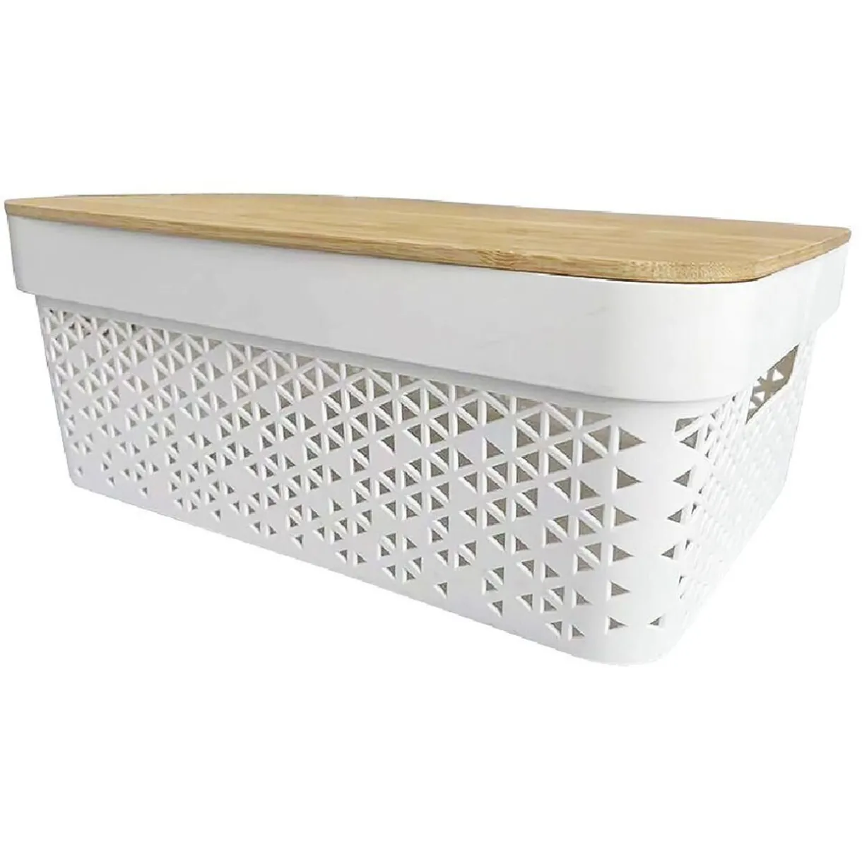 Jolie panière de rangement en plastique blanc ajouré avec couvercle en bambou. Superposable et ultra déco, cette jolie boîte de rangement trouvera sa place dans toutes les pièces de votre intérieur que ce soit dans la chambre, la cuisine ou la salle de bain…