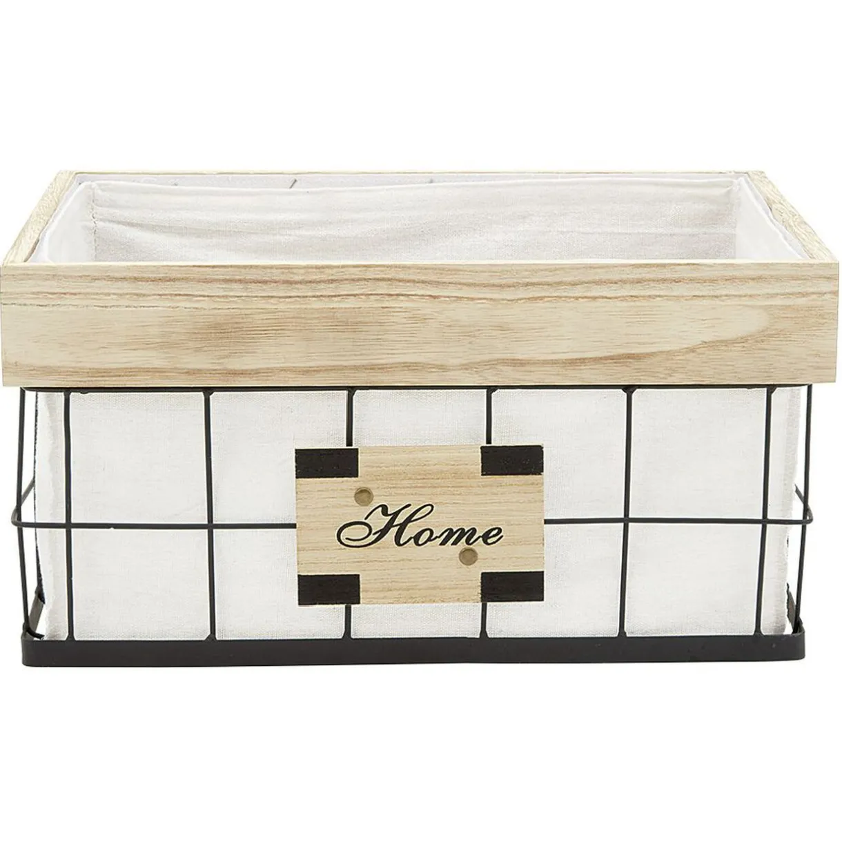 Panière déco carrée avec inscription « Home » de couleur naturel avec quadrillage noir et tissu blanc.