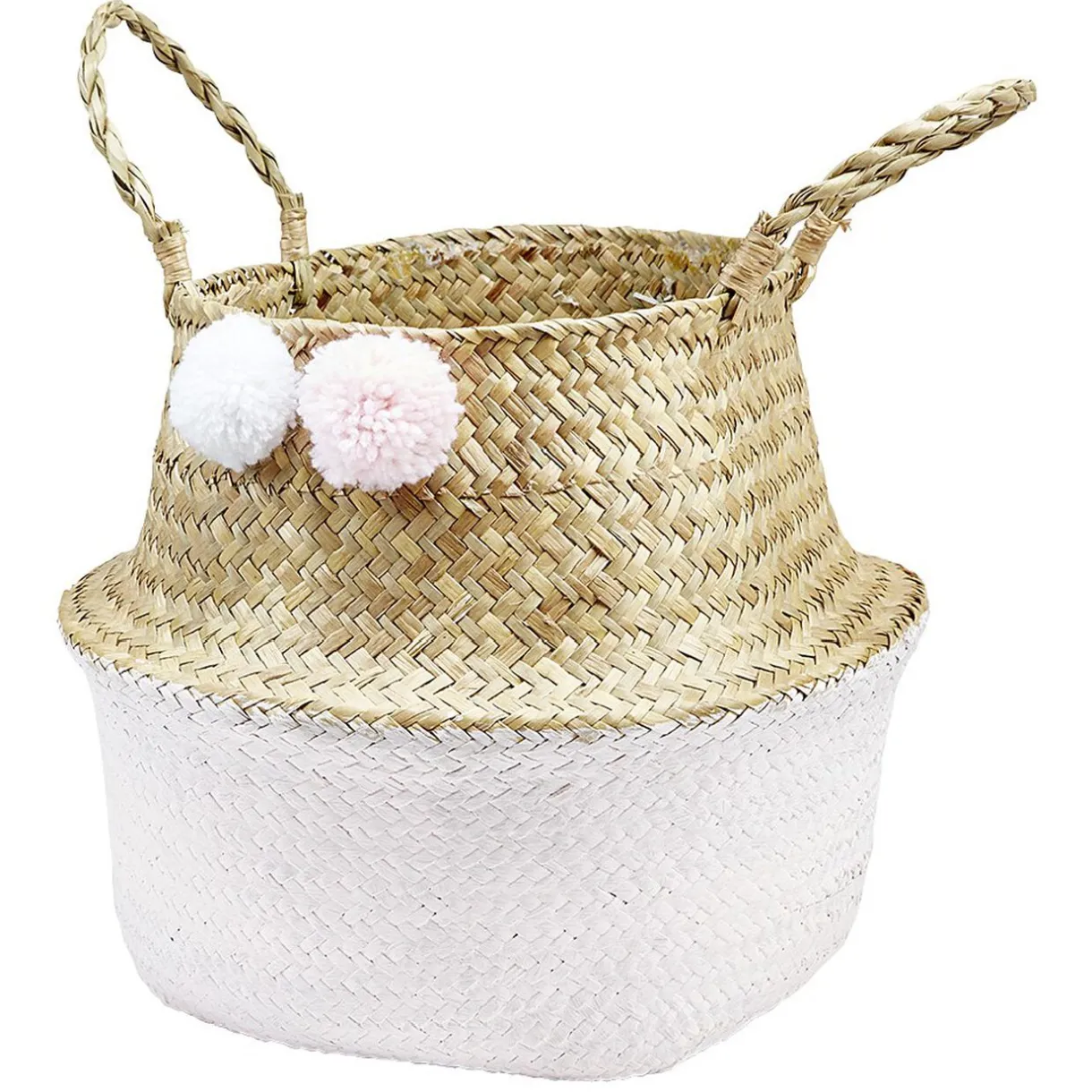 En jonc tressé, la panière est mi-naturelle mi-rose et décorée de petits pompons rose et blanc. Et pour un transport facile, la panière est équipée de 2 anses latérales.