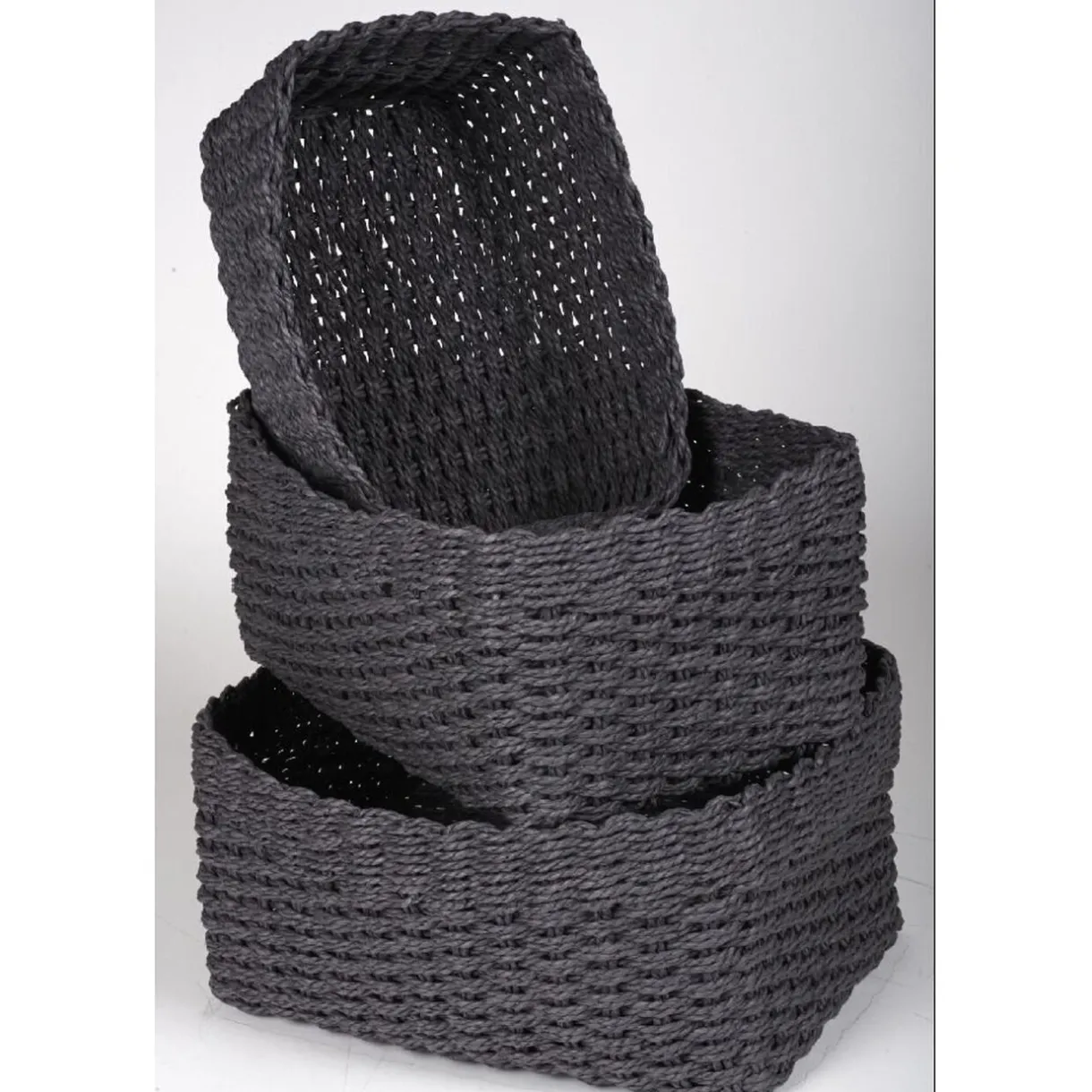 3 panières grises en corde de papier tressé, dim. 16x12x10 cm, 20x16x13 cm et 35x25x18 cm.