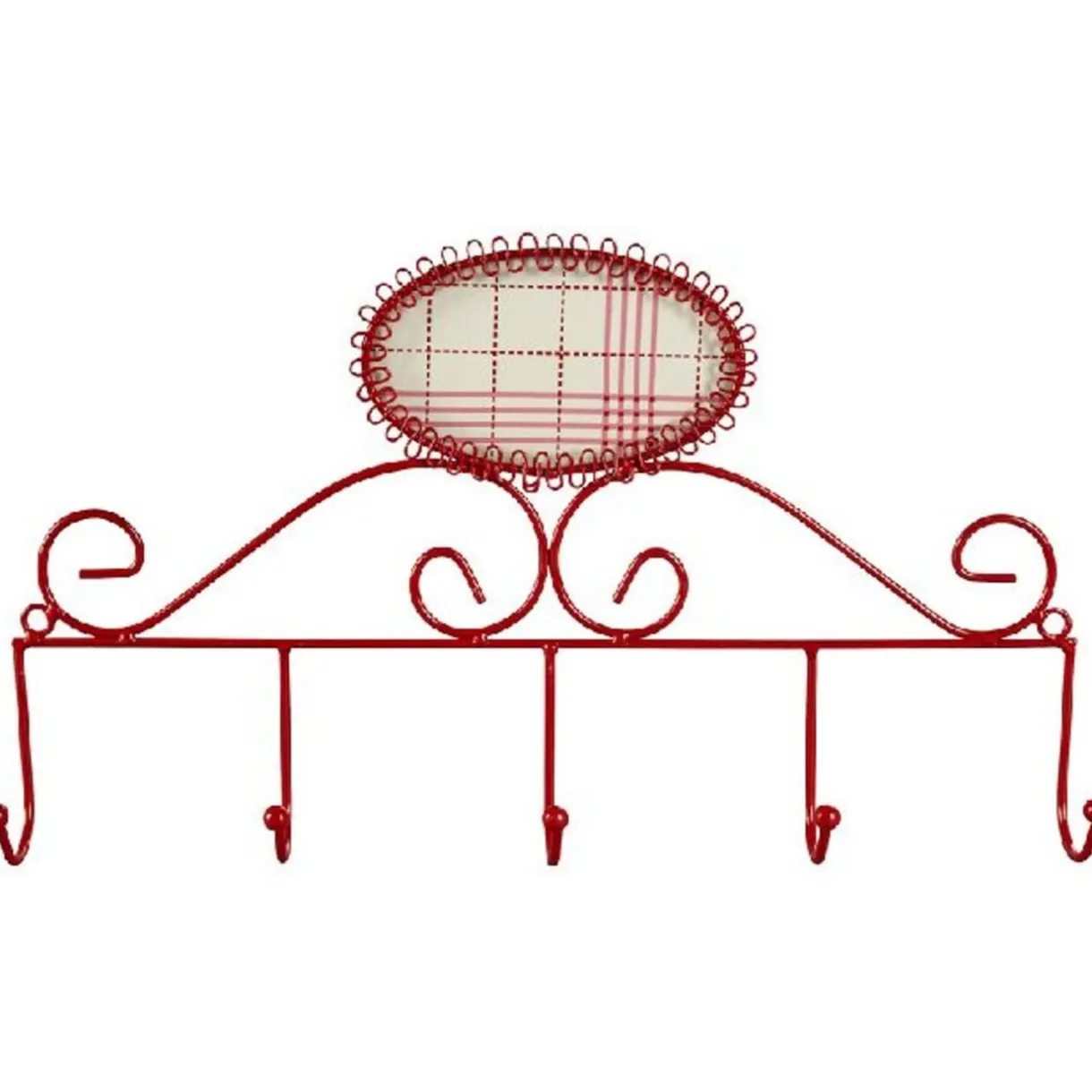 Patere en métal rouge de 5 crochets et de 41.5×23.5 cm de dimensions.Tous les objets de décoration sont chez GIFI.
