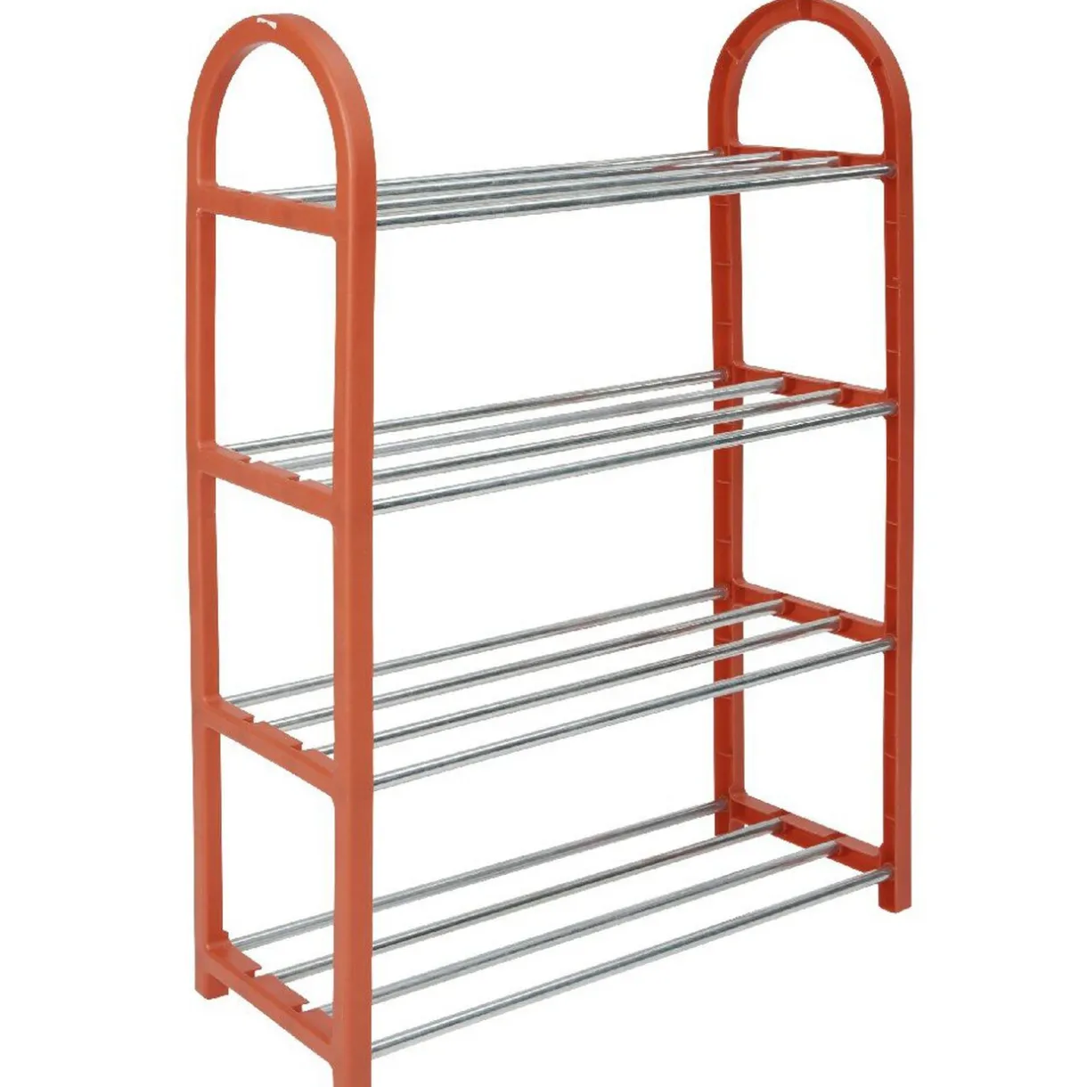 Range-chaussures à 4 niveaux rouge et gris, en plastique et zinc.