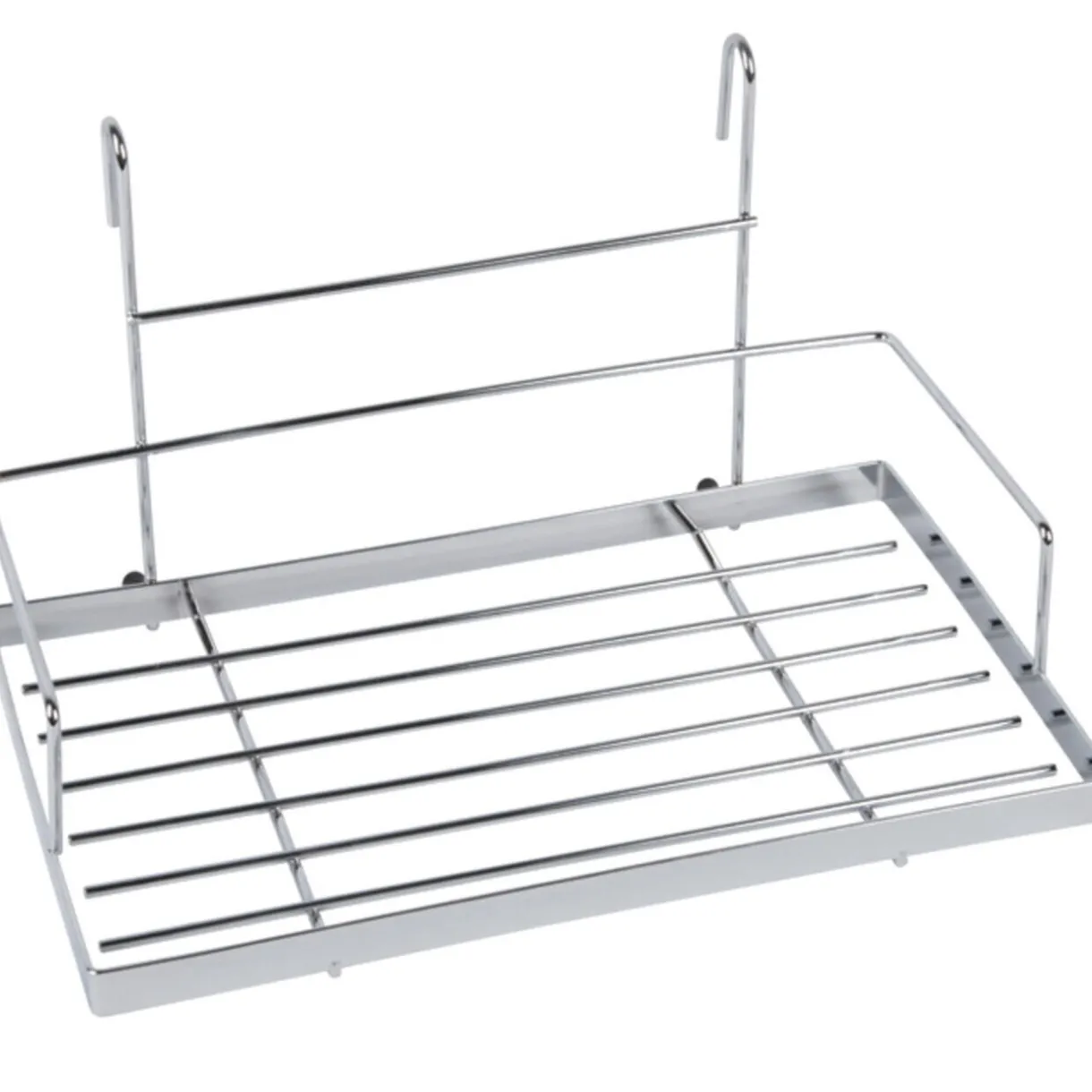 Rangement de cuisine à suspendre contenant : 1 support essuie-tout, 6 crochets, 2 barres L. 58 cm avec système d’accroche et 1 étagère, métal chromé.