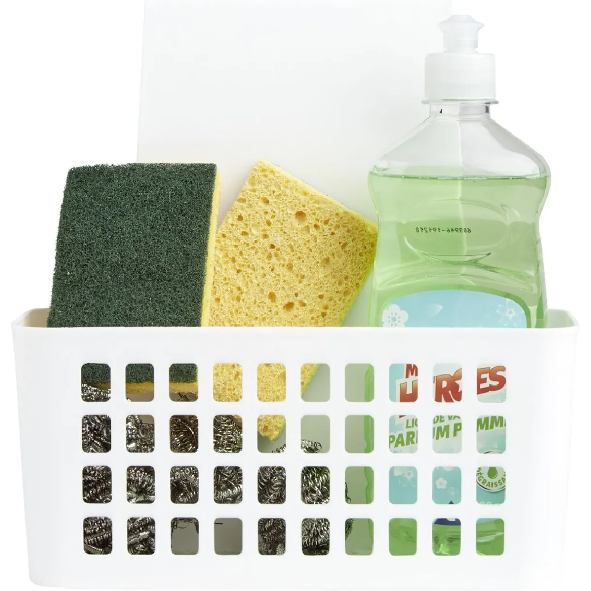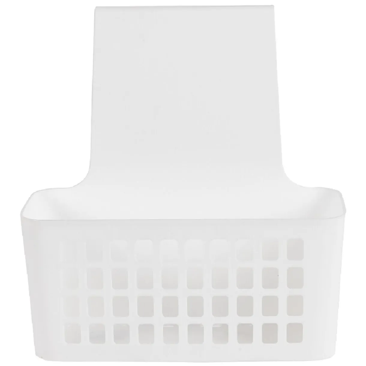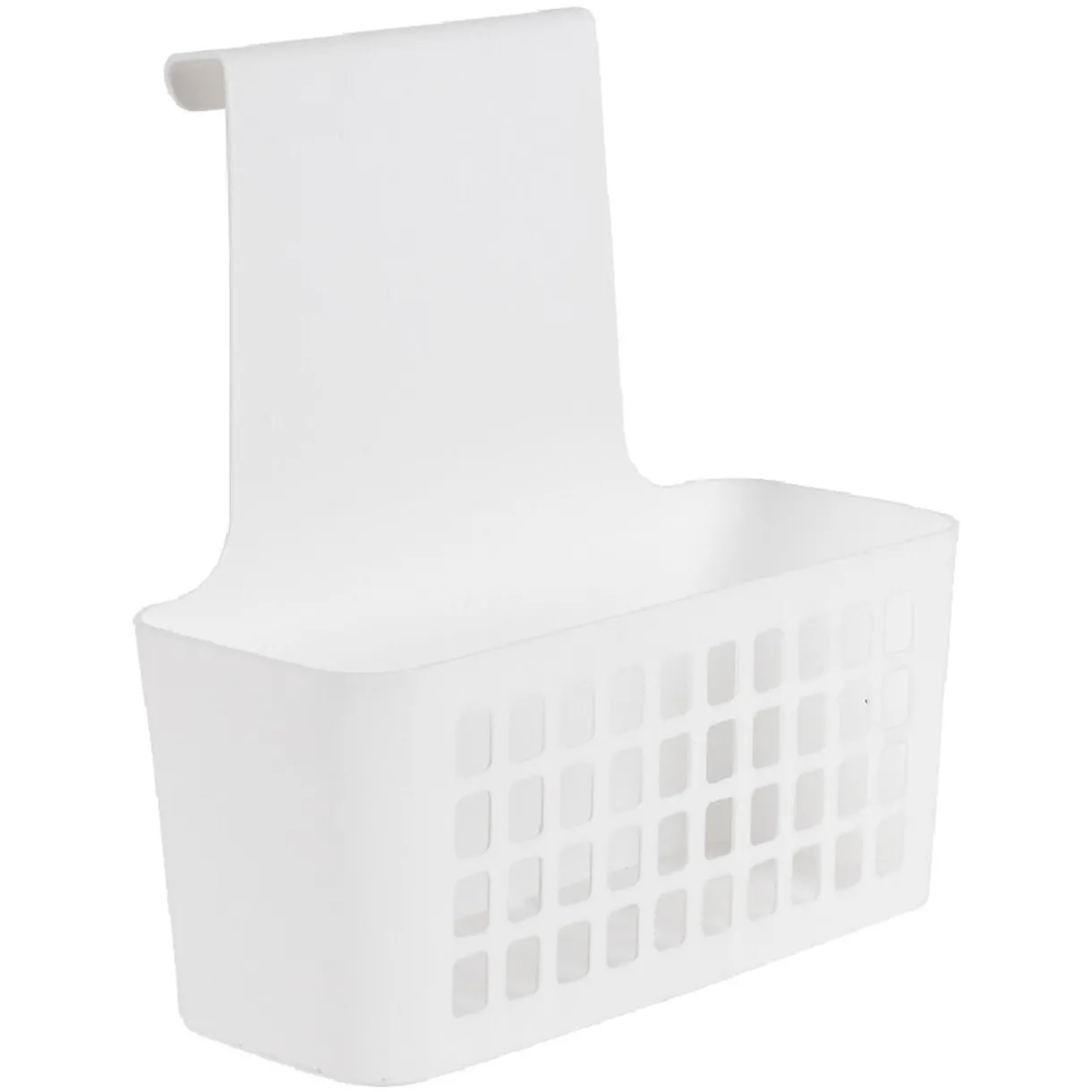 Rangement en plastique ajouré blanc. A accrocher sur la face intérieure ou extérieure d’une porte de placard, armoire de cuisine ou de salle de bain.