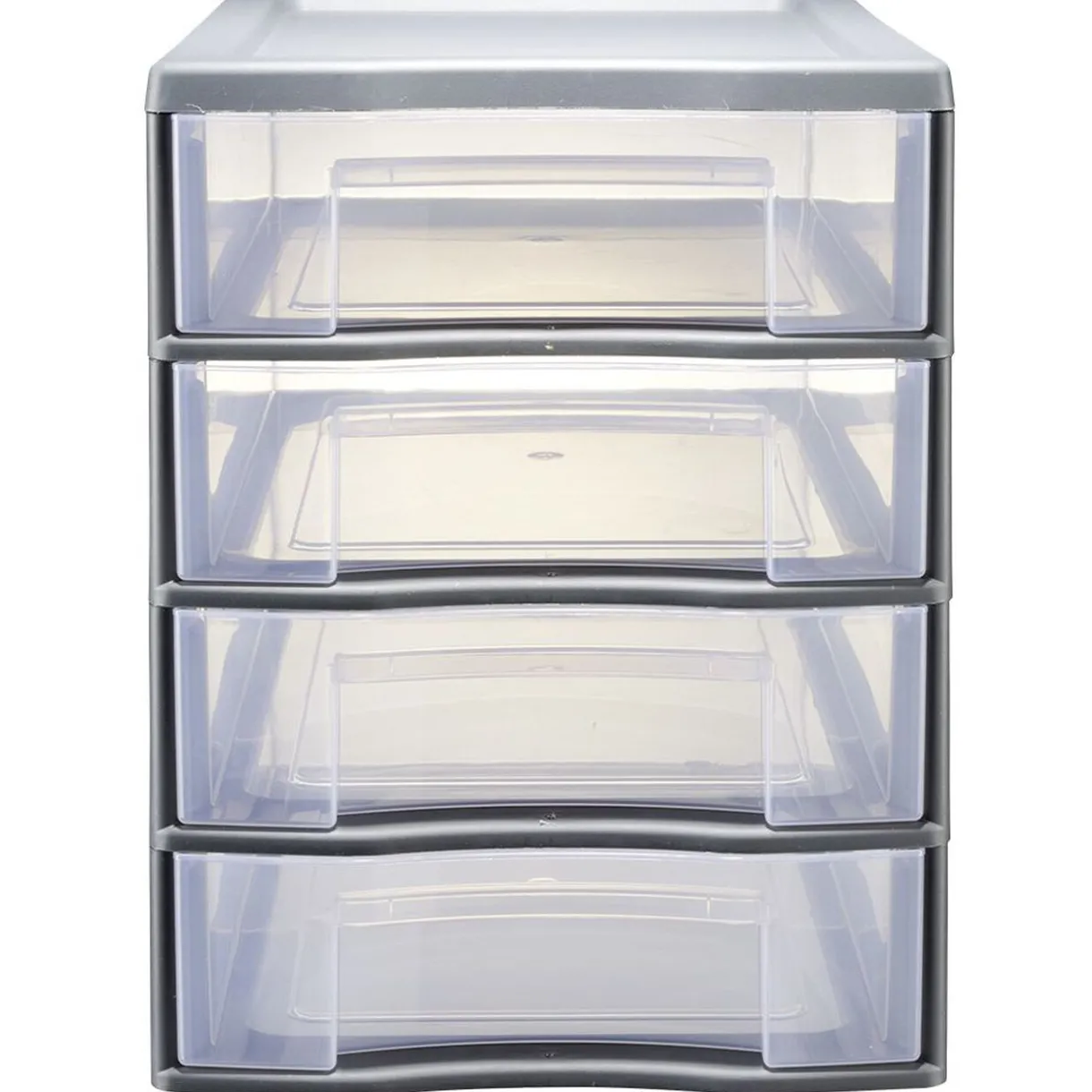 Ordonnez vos papiers au format A4 dans cette tour de rangement grise et blanc transparent munie de quatre tiroirs.