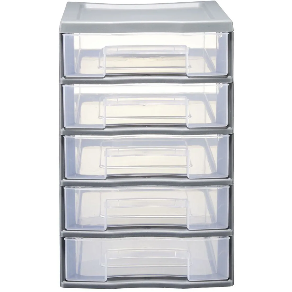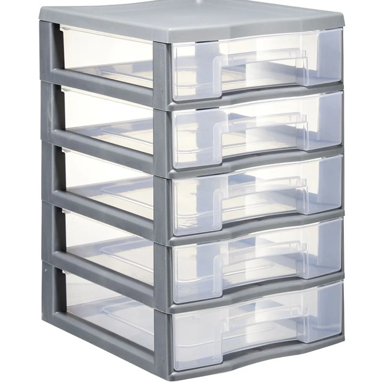 Tour de rangement en plastique gris composée de 5 tiroirs au format A6 plus. Idéale pour organiser vos affaires dans le bureau ou l’atelier.