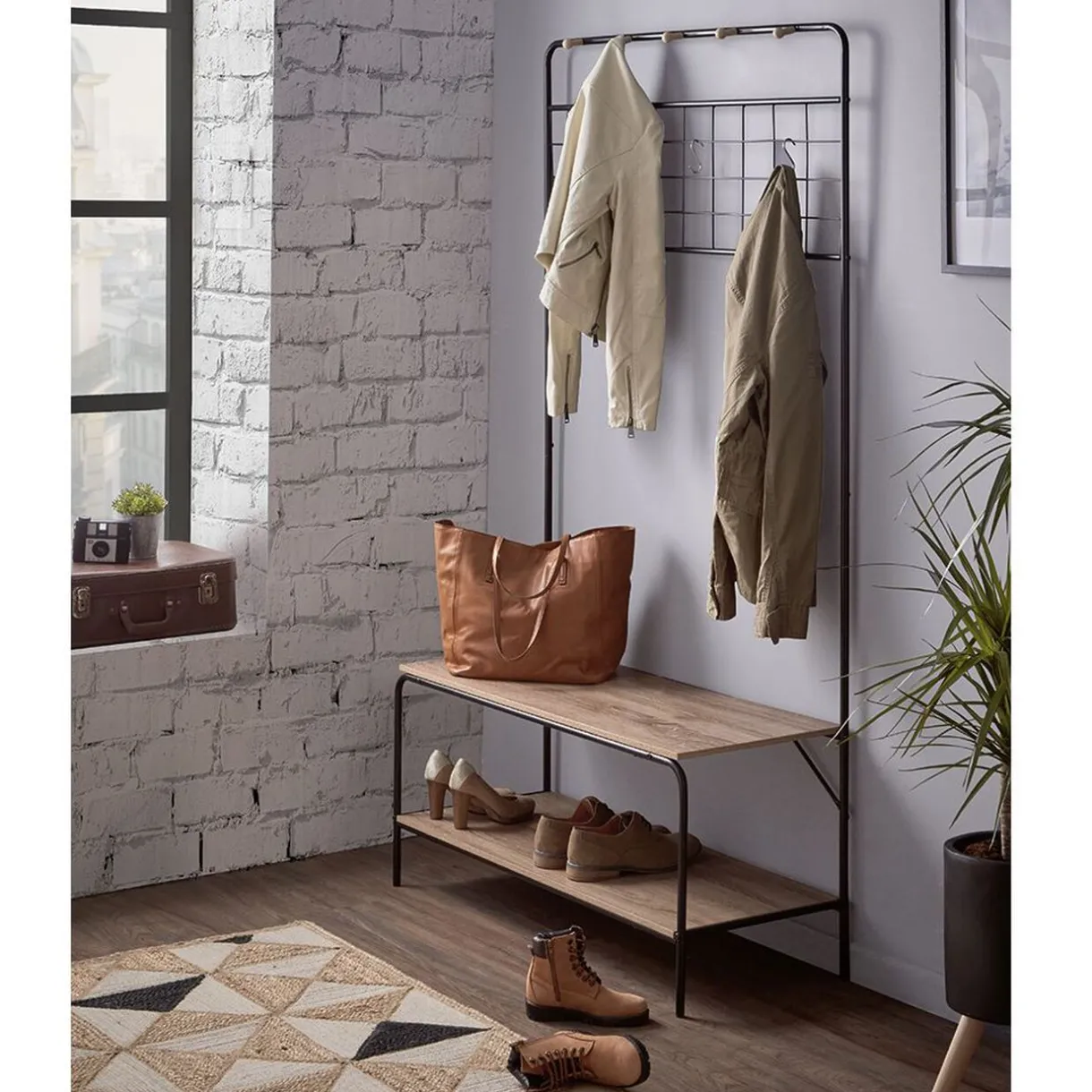 Vestiaire doté d’une structure en métal surplombée de 3 crochets inclus pour accrocher vos vêtements sans les foisser ainsi que d’un banc de rangement permettant de mettre en enlever vos chaussures puis de facilement les ranger en dessous. En plus d’être pratique pour le rangement, son design minimaliste se mariera parfaitement avec votre déco intérieure.