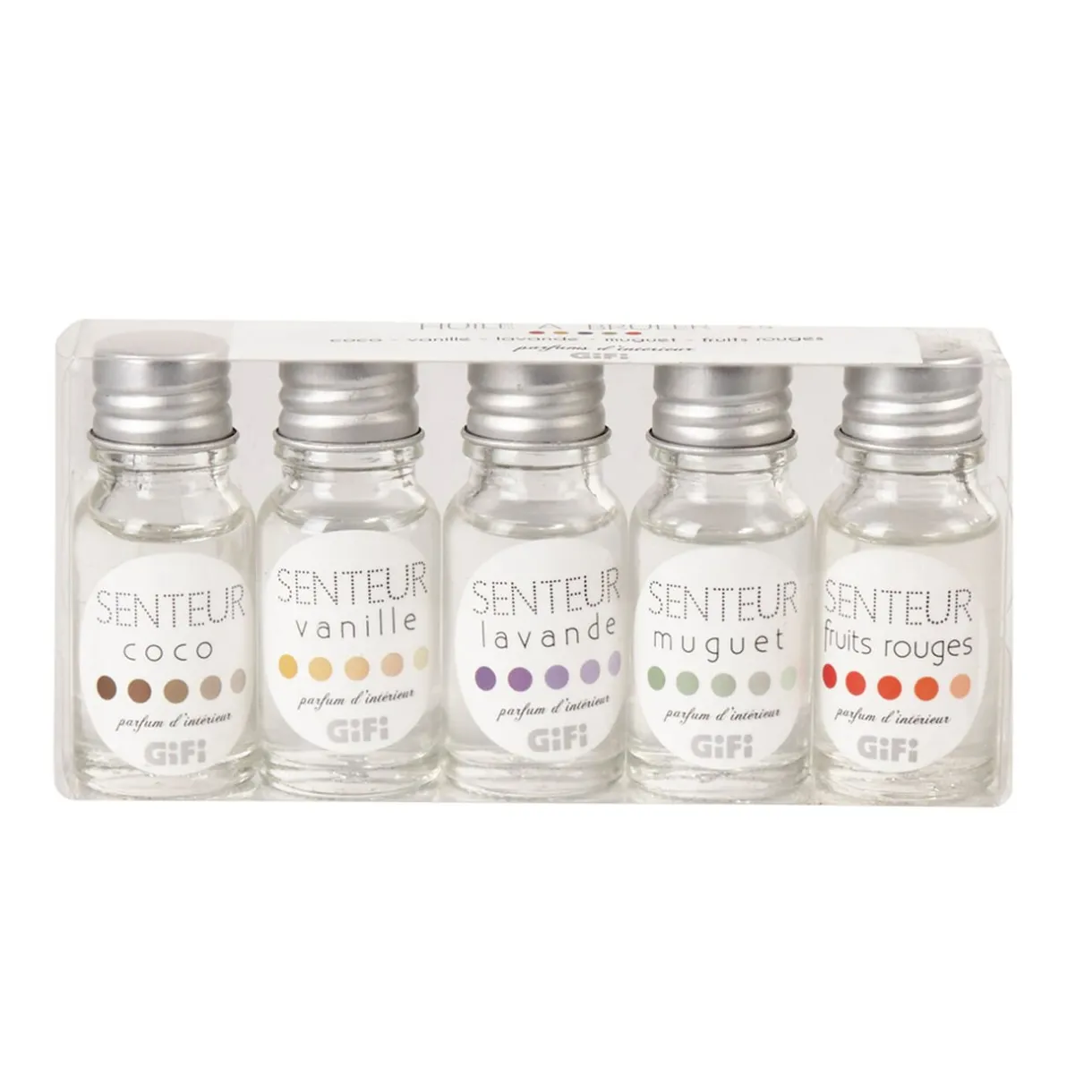 5 huiles parfumées, h. 6 cm, parfum coco, vanille, fruits rouges, lavande et muguet.