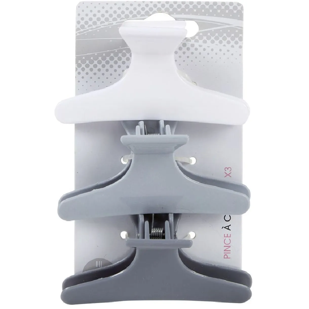 Lot de 3 pinces à cheveux en plastique uni blanc, gris clair et gris foncé.