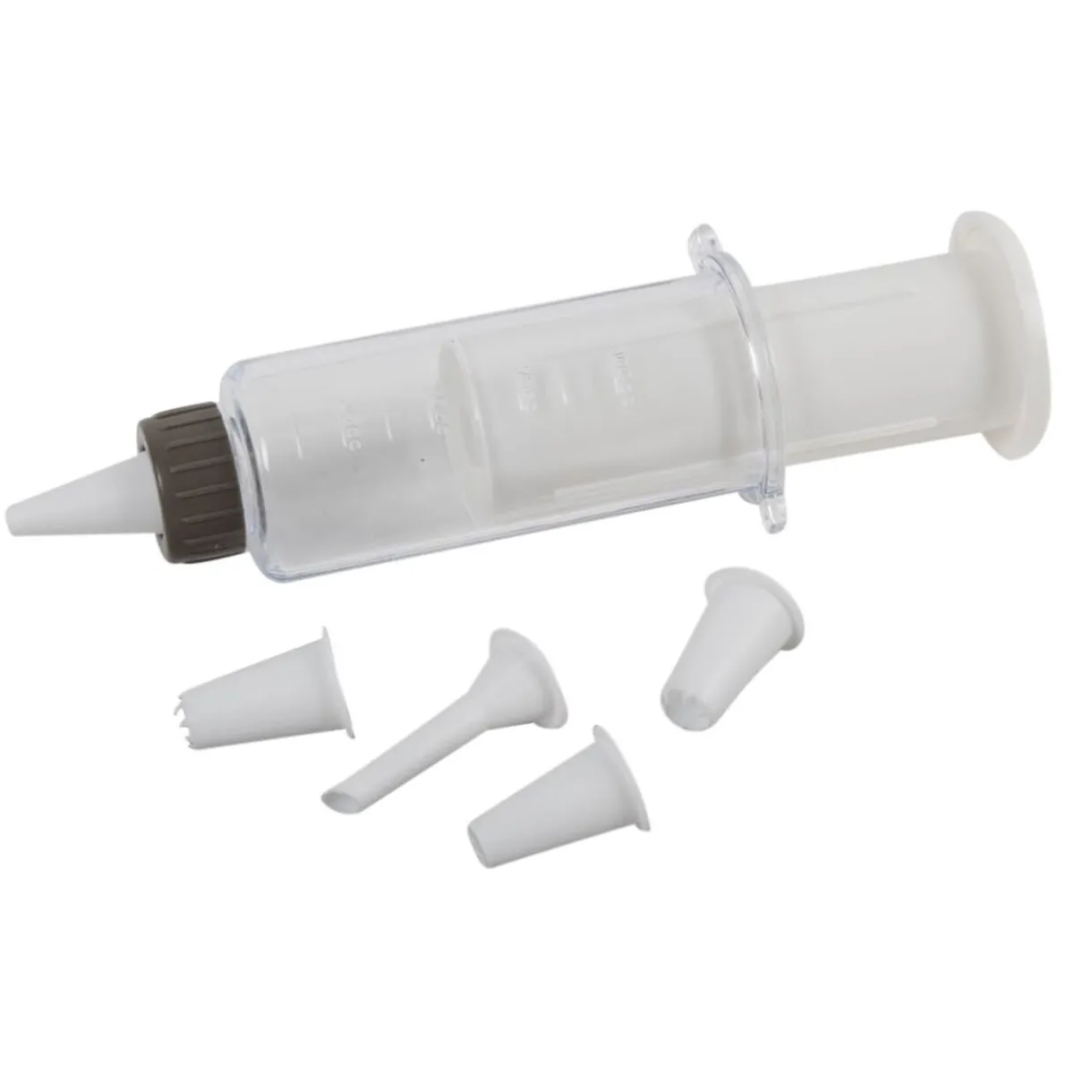 Seringue à pâtisserie blanche et grise avec 4 embouts de formes diffrentes.