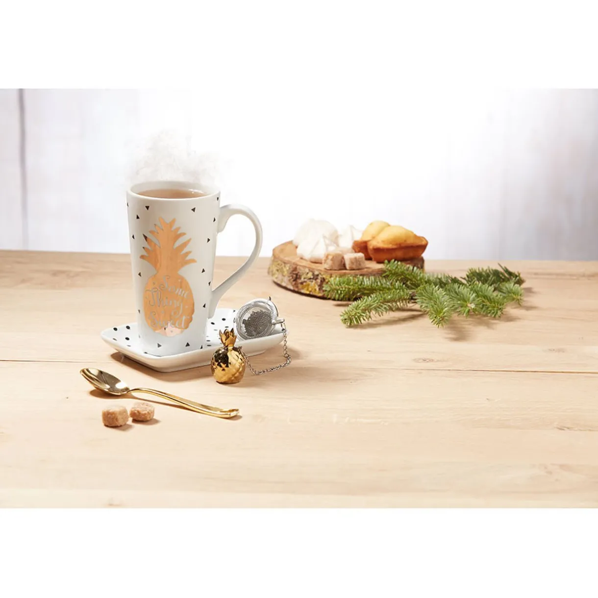 Accordez-vous une pause avec un thé tout doux. Le plaisir d’une bonne infusion dans un service à thé en porcelaine, joyeux et à croquer, quoi de mieux ? Remplissez votre infuseur qui flottera grâce au petit poids ananas doré, remplissez votre tasse blanche au motif ananas et servez-vous grâce au plateau blanc aux pois dorés. Infusion à l’ananas l’été, ce service vous amènera le soleil l’hiver avec une bonne tisane chaude.