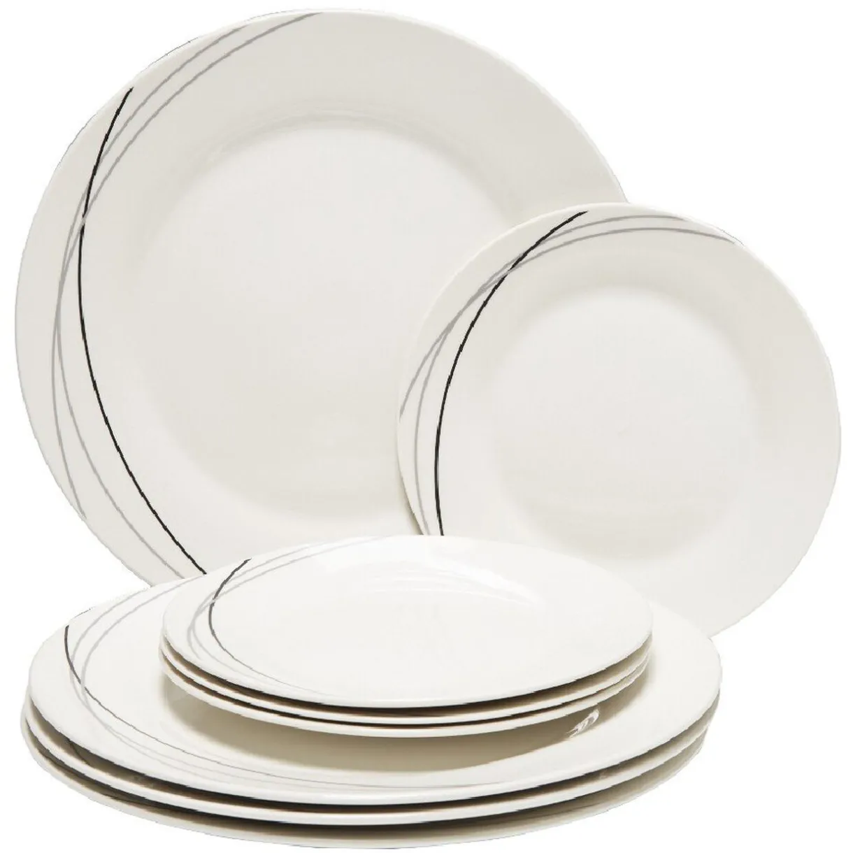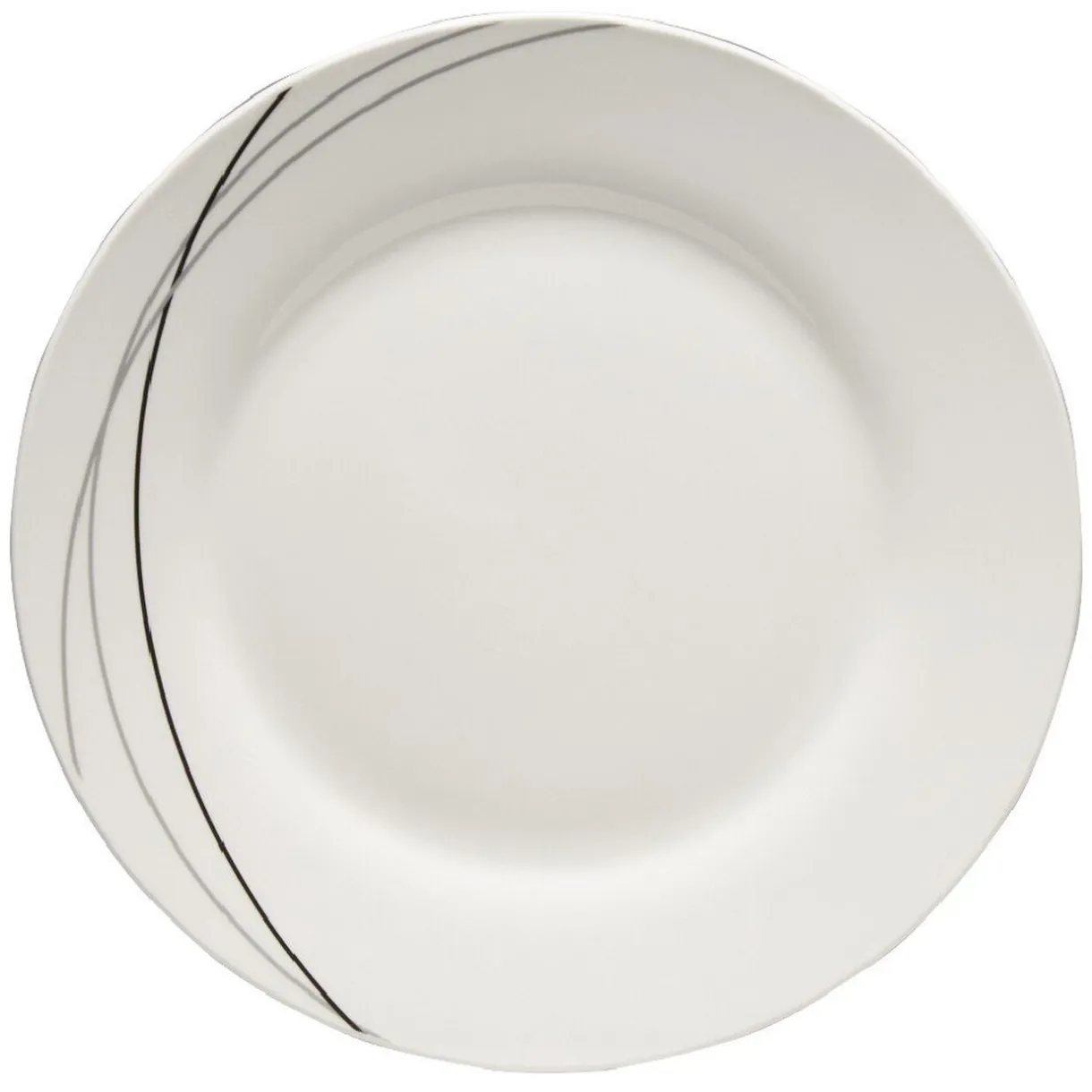 Équipez-vous en assiettes plates et à desserts avec ce service à vaisselle 8 pièces en porcelaine de couleur blanche avec 3 lignes courbées grises et noires sur un rebord de l’assiette.