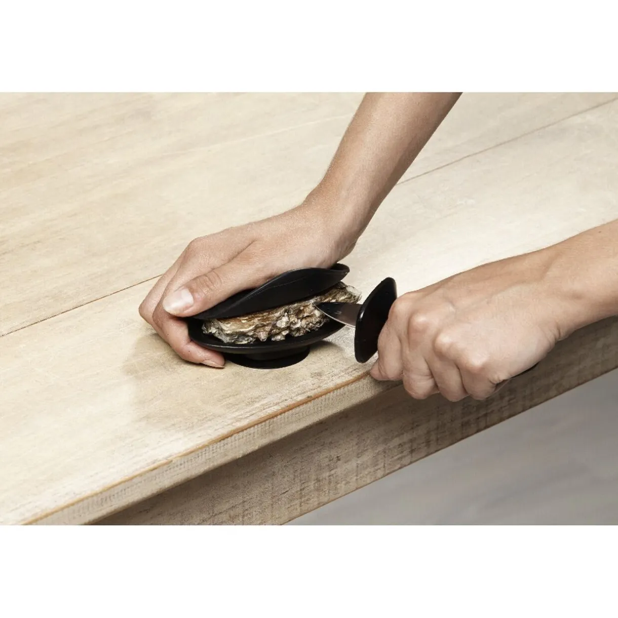 Set à huîtres comprenant 1 couteau L. 12 cm et 1 cale dim. 15×5,5×4 cm, silicone.