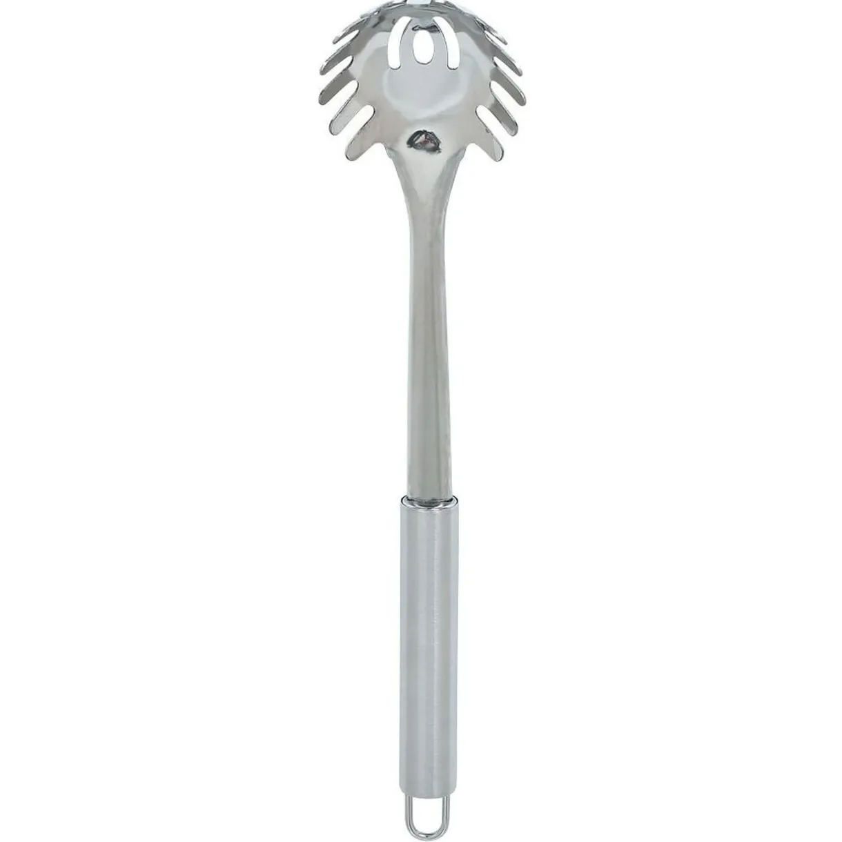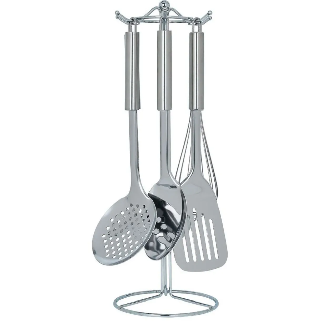 Cet ensemble pratique de 6 ustensiles de cuisine en acier inoxydable gris comprend : une spatule, une cuillère, une louche, une cuillère à spaghetti, une écumoire et un fouet.