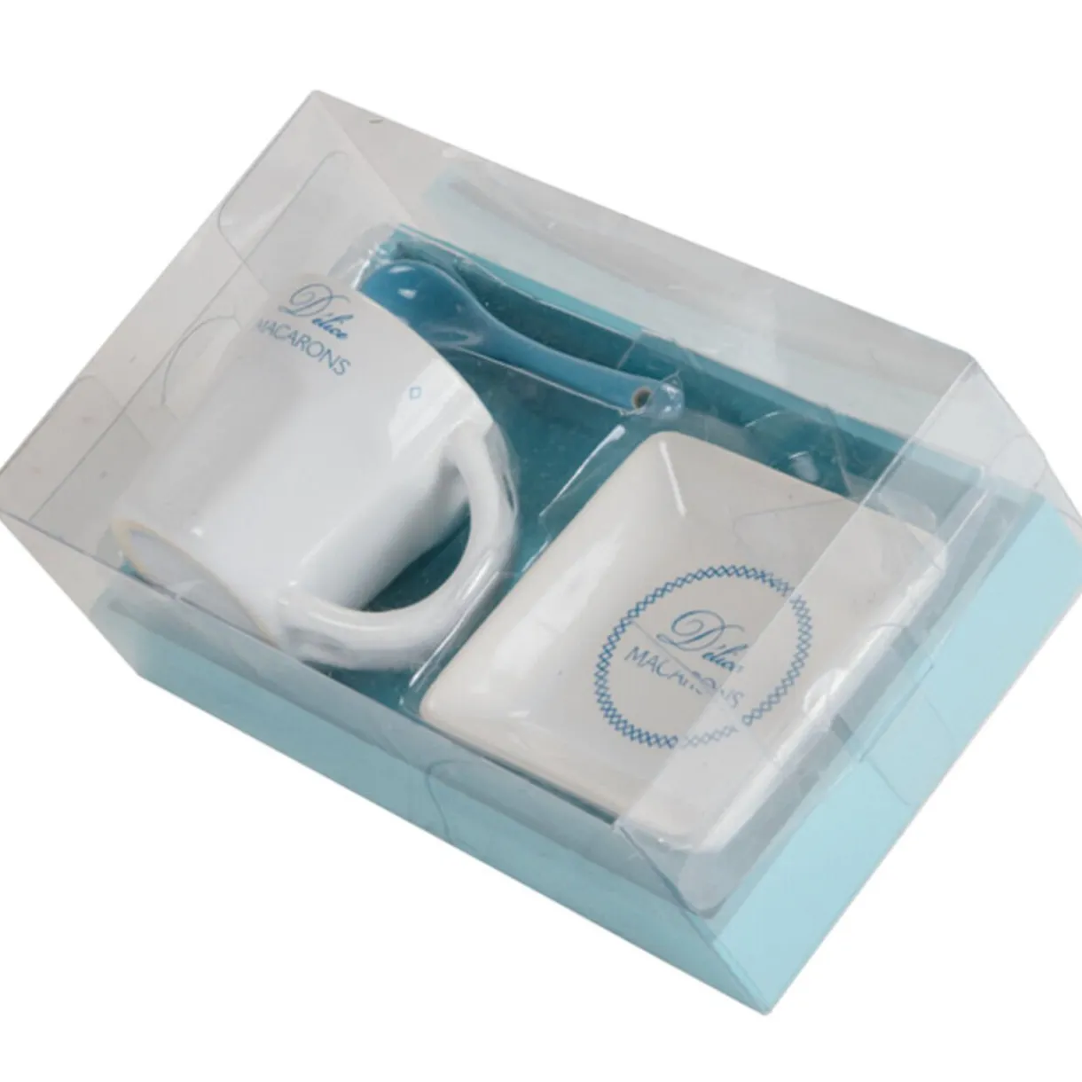 Set petit déjeuner en céramique comprenant 1 tasse, 1 cuillère, 1 repose-sachet. Inclus un plateau en bois, dim. 19x11x3 cm.Diff. coloris, disponibilité selon arrivage.