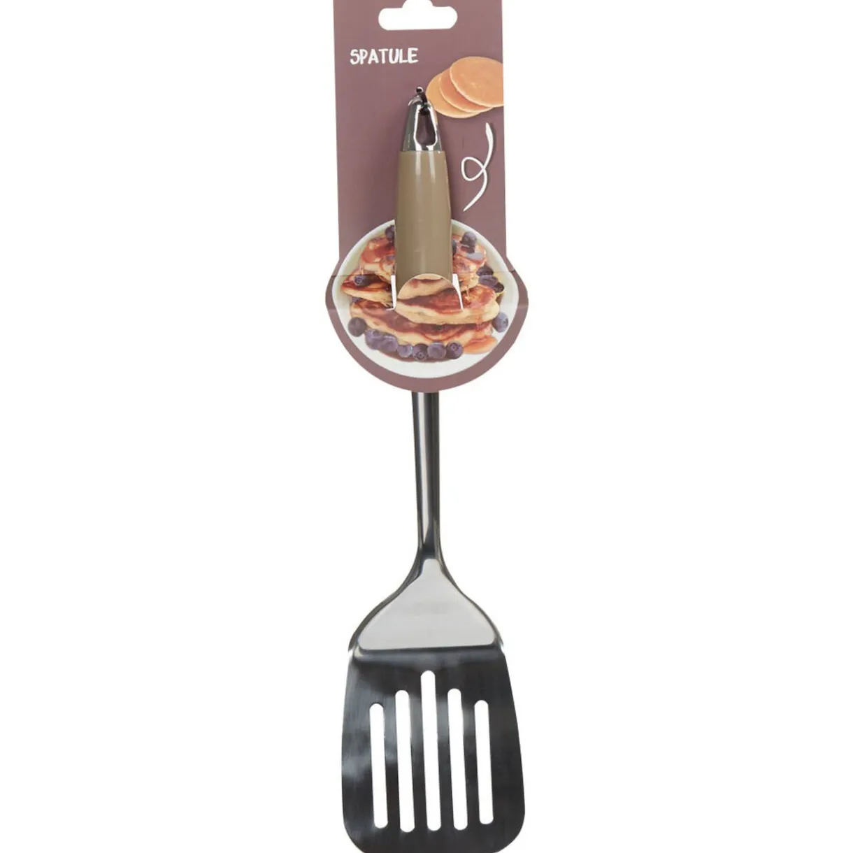 Spatule à trous en inox avec manche en plastique coloris taupe.