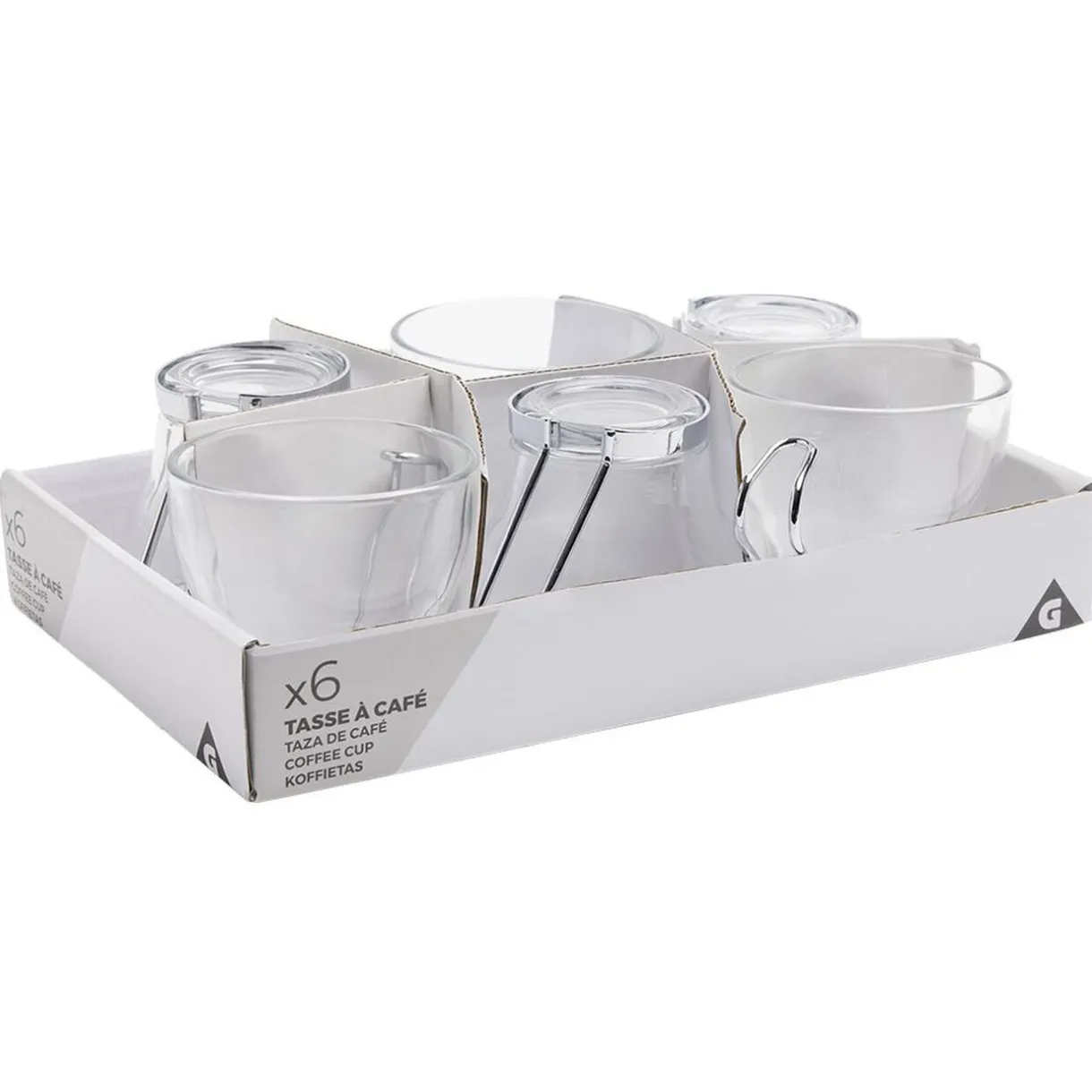 6 tasses à café originales en verre avec anse en métal.