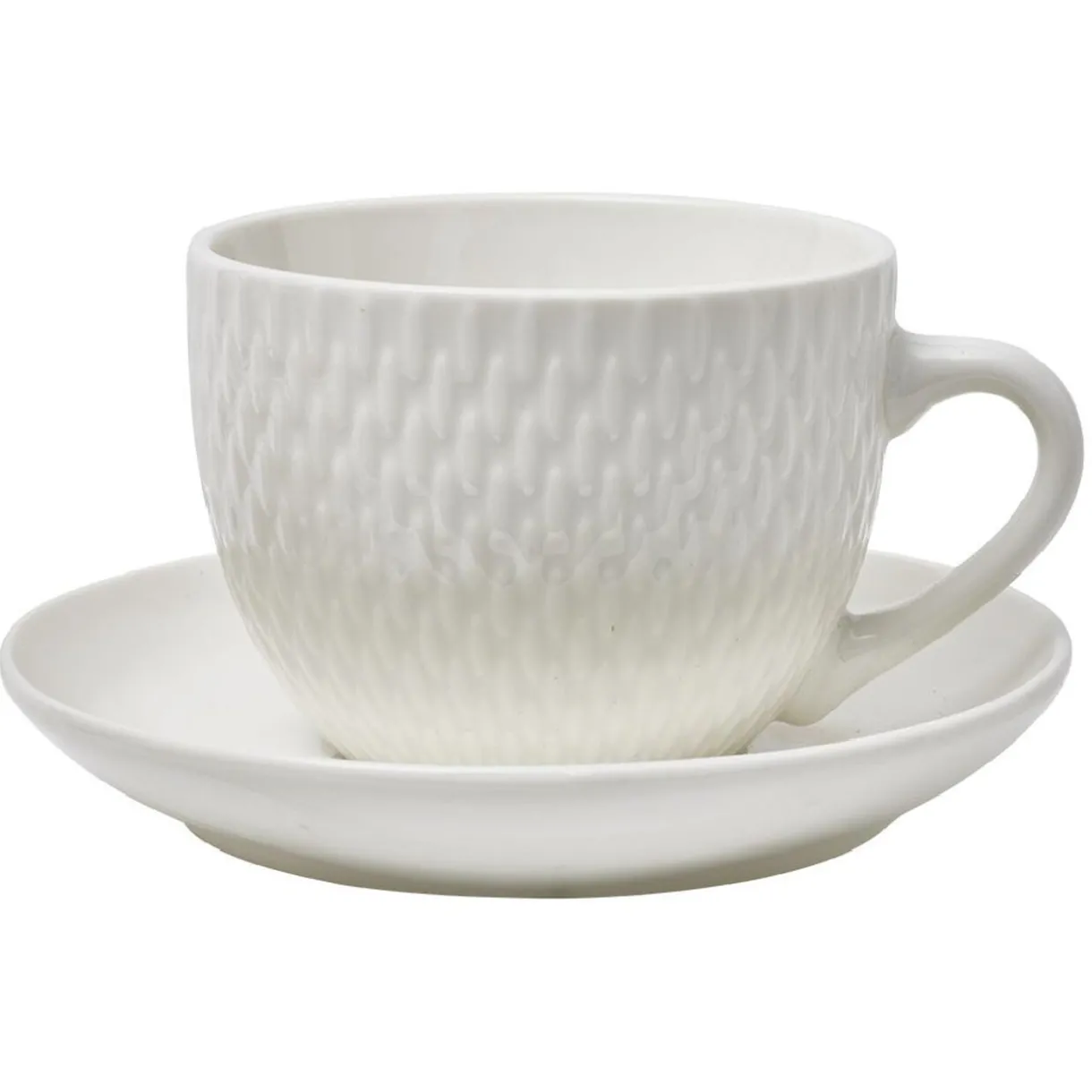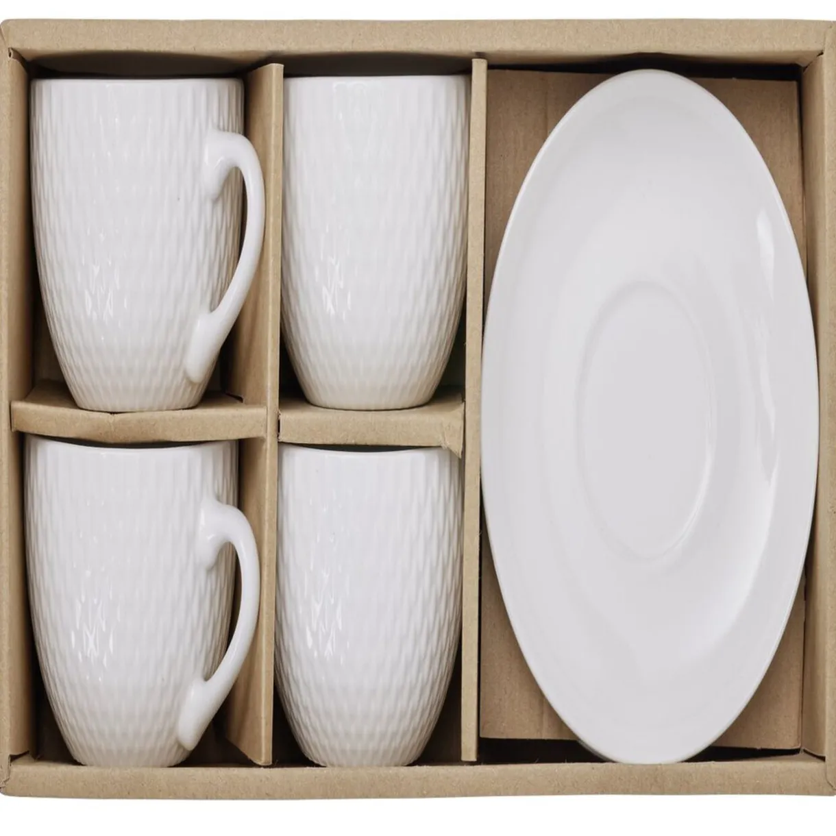 Service de 4 tasses blanches embossées avec ses sous-tasses lisses assorties, idéal pour boire le café !