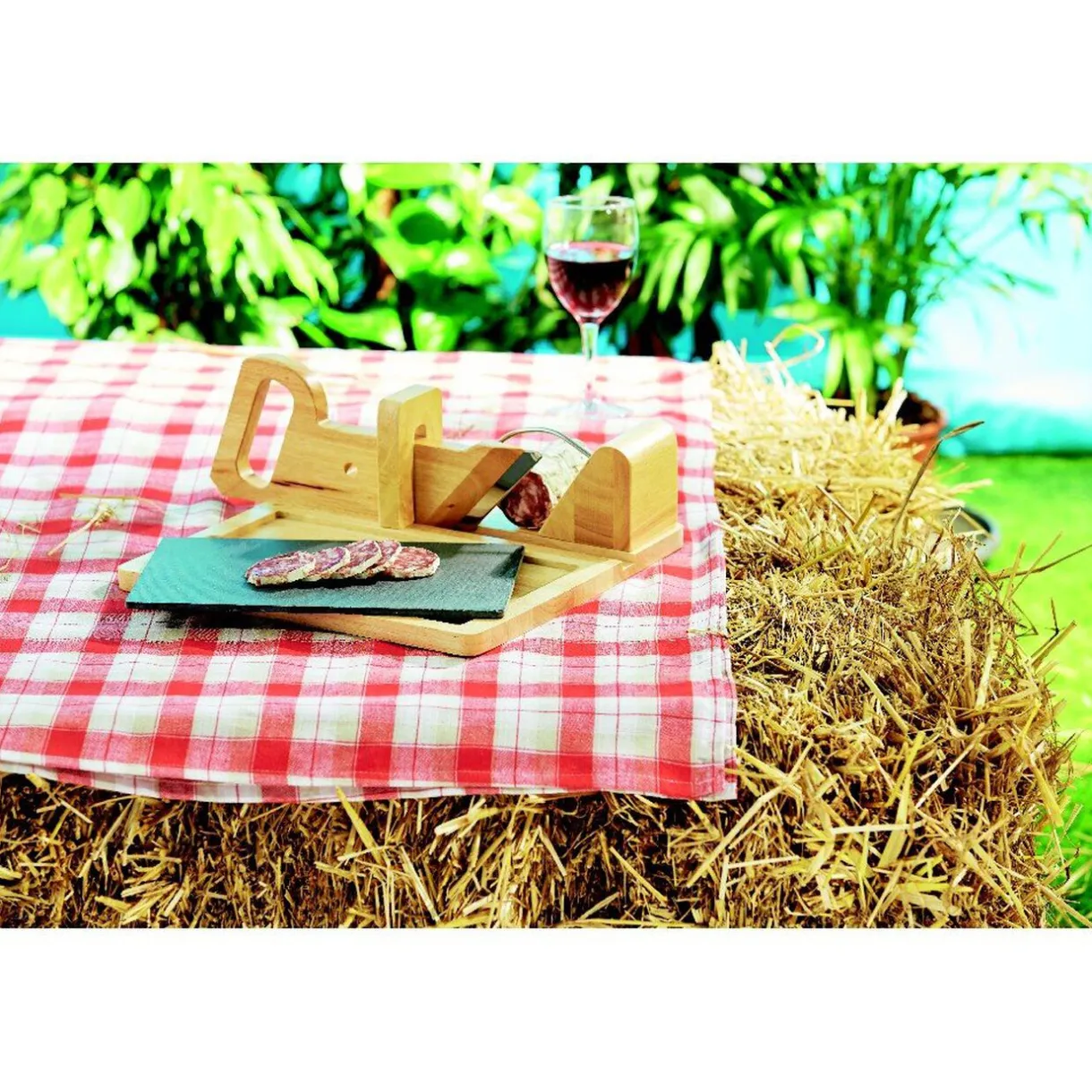 Trancheuse à saucisson en bois avec plateau en ardoise amovible.