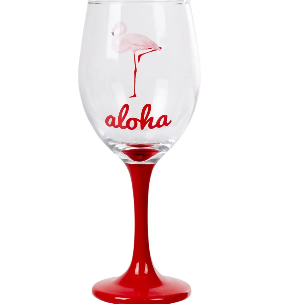 Verre à pied rouge style tropical avec motif aloha et flamant rose. Découvrez sur notre site, la verrerie de la même gamme !