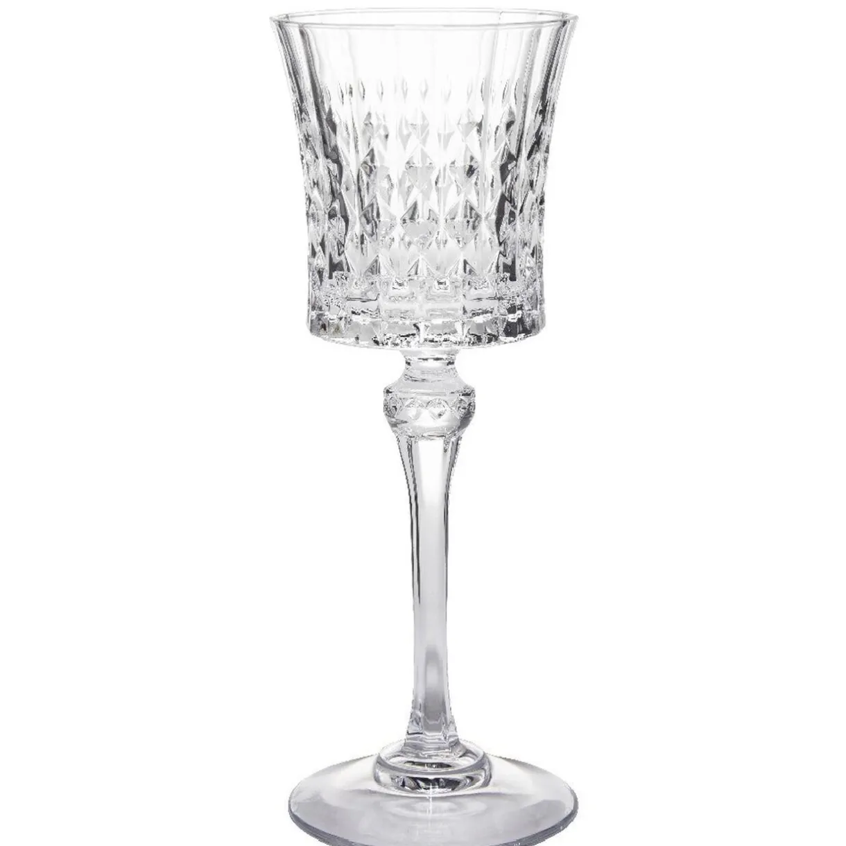 Lot de 6 verres à pied Lady Diamond d’une contenance de 19 cl. Idéal pour déguster votre vin préféré et apporter une touche chic à votre table grâce à son aspect diamanté transparent.