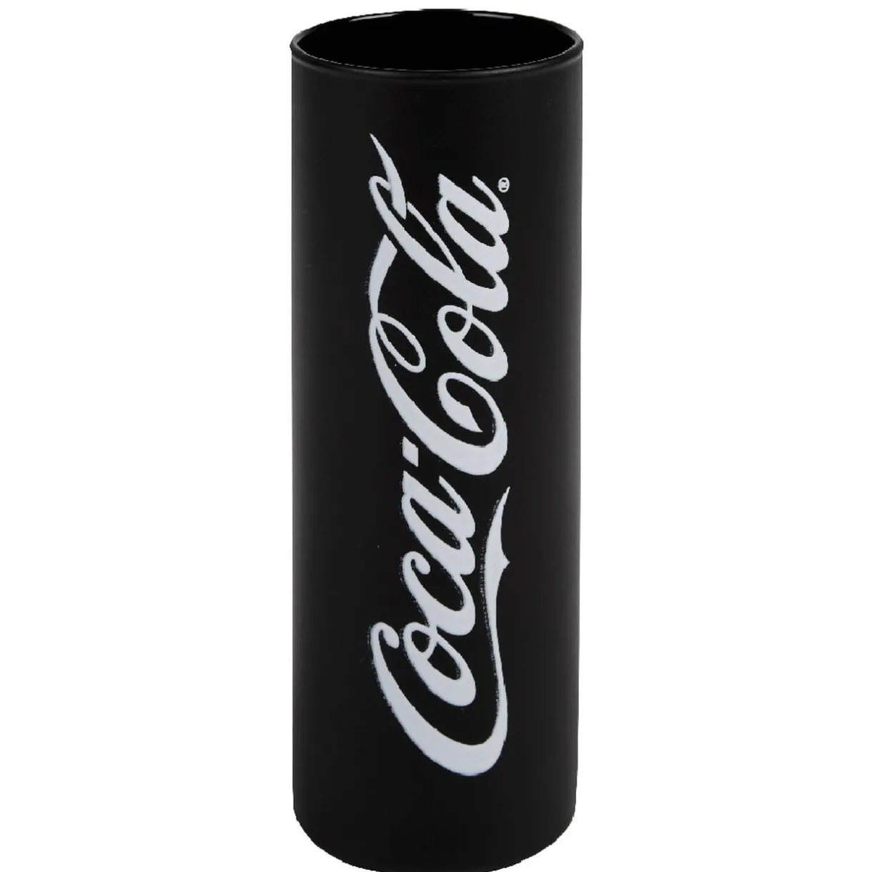 Verre Coca-Cola frozen noir et blanc forme tube, d’une contenance de 27 cl.