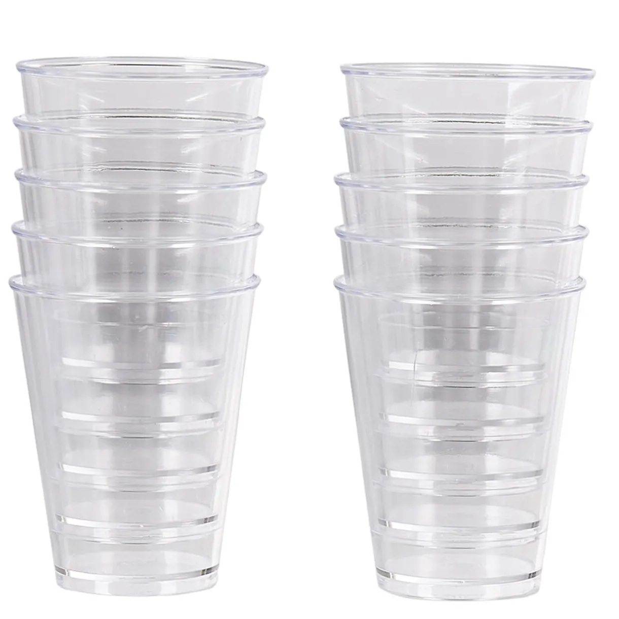 Lot de 10 verrines en forme de petits verres en plastique transparent lavables, réutilisables et recyclables.