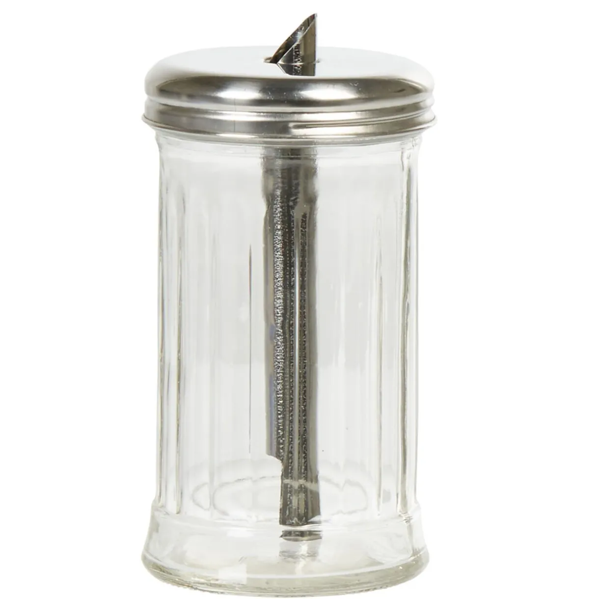 Verseuse à sucre ø 7,5×13 cm, en verre transparent et couvercle métallique.