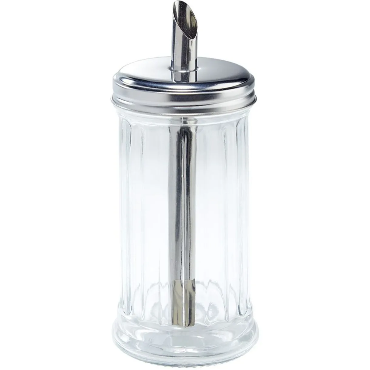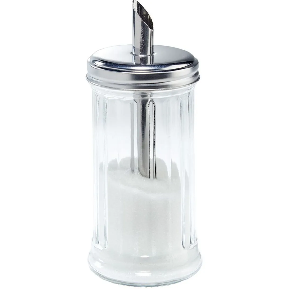 Verseuse à sucre en verre transparent avec couvercle métallique.