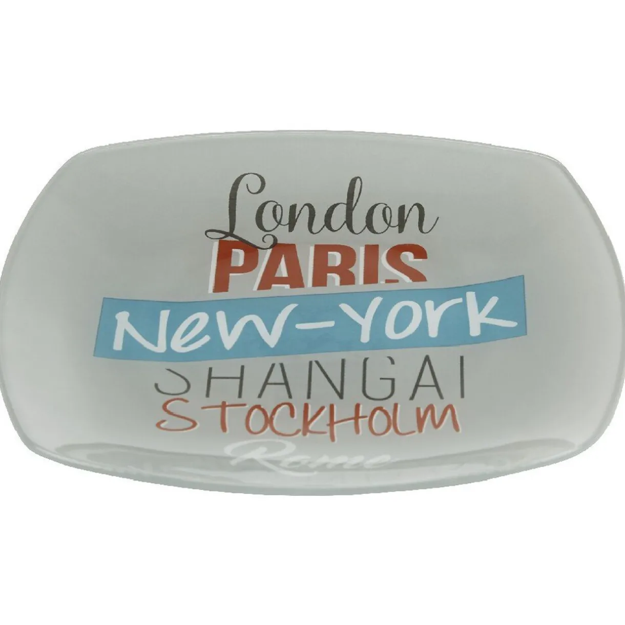 Assiette à dessert carrée à bord arrondi design city avec inscription « London, Paris, New York, Shangai, Stockholm, Rome ».