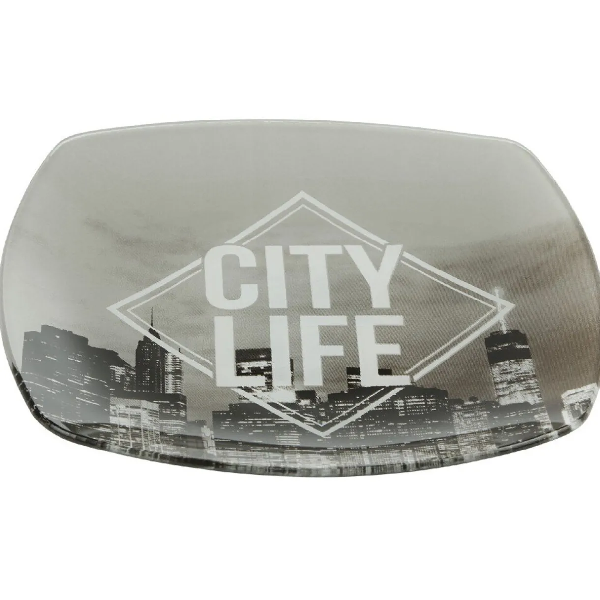 Assiette à dessert carrée à bord arrondi design city de couleur noir et blanc.