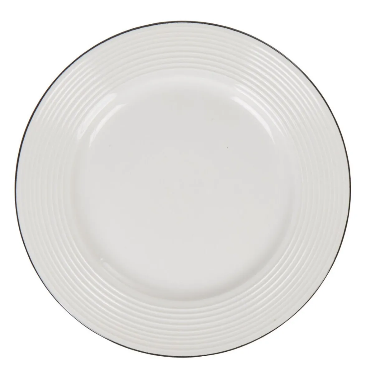 Elégance et sobriété au menu avec cette assiette à dessert ronde en faïence blanche avec une fine bordure noire. Nous vous proposons l’assiette classique assortie ainsi qu’un large choix de ménagères et de verres afin de compléter votre service à vaisselle.